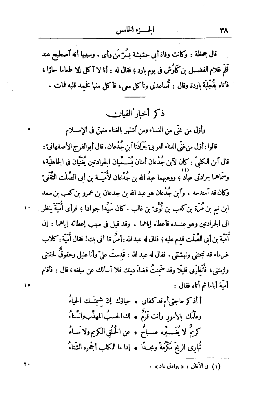 قال ابن الكلبىّ: كان لابن جدعان أمتان يسمّيان الجرادتين يغنّيان فى الجاهليّة، وسمّاهما جرادتى عباد [1] ؛ ووهبهما عبد الله بن جدعان لأميّة بن أبى الصّلت الثّقفىّ وكان قد امتدحه. وابن جدعان هو عبد الله بن جدعان بن عمرو بن كعب بن سعد ابن تيم بن مرّة بن كعب بن لؤىّ بن غالب. كان سيّدا جوادا؛ فرأى أميّة ينظر الى الجرادتين وهو عنده فأعطاه إياهما. وقد قيل فى سبب إعطائه إياهما: إن أميّة بن أبى الصّلت قدم عليه؛ فقال له عبد الله: أمر ما أتى بك! فقال أميّة: كلاب غرماء قد نجتنى ونهشتنى. فقال له عبد الله: قدمت علىّ وأنا عليل وحقوق لحقتنى ولزمتنى، فأنظرنى قليلا وقد ضمنت قضاء دينك فلا أسألك عن مبلغه، قال: فأقام أميّة أياما ثم أتاه فقال: