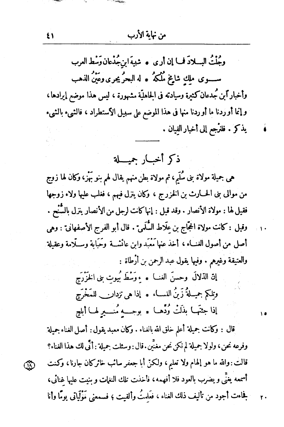 قال: وكانت جميلة أعلم خلق الله بالغناء. وكان معبد يقول: أصل الغناء جميلة وفرعه نحن، ولولا جميلة لم نكن نحن مغنّين. قال: وسئلت جميلة: أنّى لك هذا الغناء؟