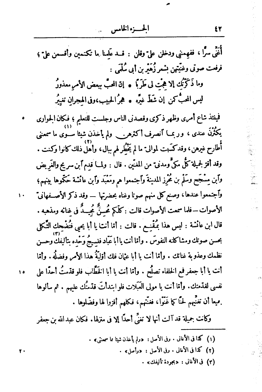 قال ابن عائشة: ليس هذا بمقنع. قالت: أمّا أنت يا أبا يحيى فتضحك الثّكلى بحسن صوتك ومشاكلته النفوس. وأمّا أنت يا أبا عبّاد فنسيج وحده بتأليفك [3] وحسن نظمك وعذوبة غنائك. وأمّا أنت يا أبا عثمان فلك أوّليّة هذ الأمر وفضله. وأمّا أنت يا أبا جعفر فمع الخلفاء تصلح. وأمّا أنت يا أبا الخطّاب فلو قدّمت أحدا على نفسى لقدّمتك. وأمّا أنت يا مولى العبلات فلو ابتدأت قدّمتك عليهم. ثم سألوها جميعا أن تغنّيهم لحنا كما غنّوا، فغنّتهم، فكلهم أقرّوا لها وفضّلوها.