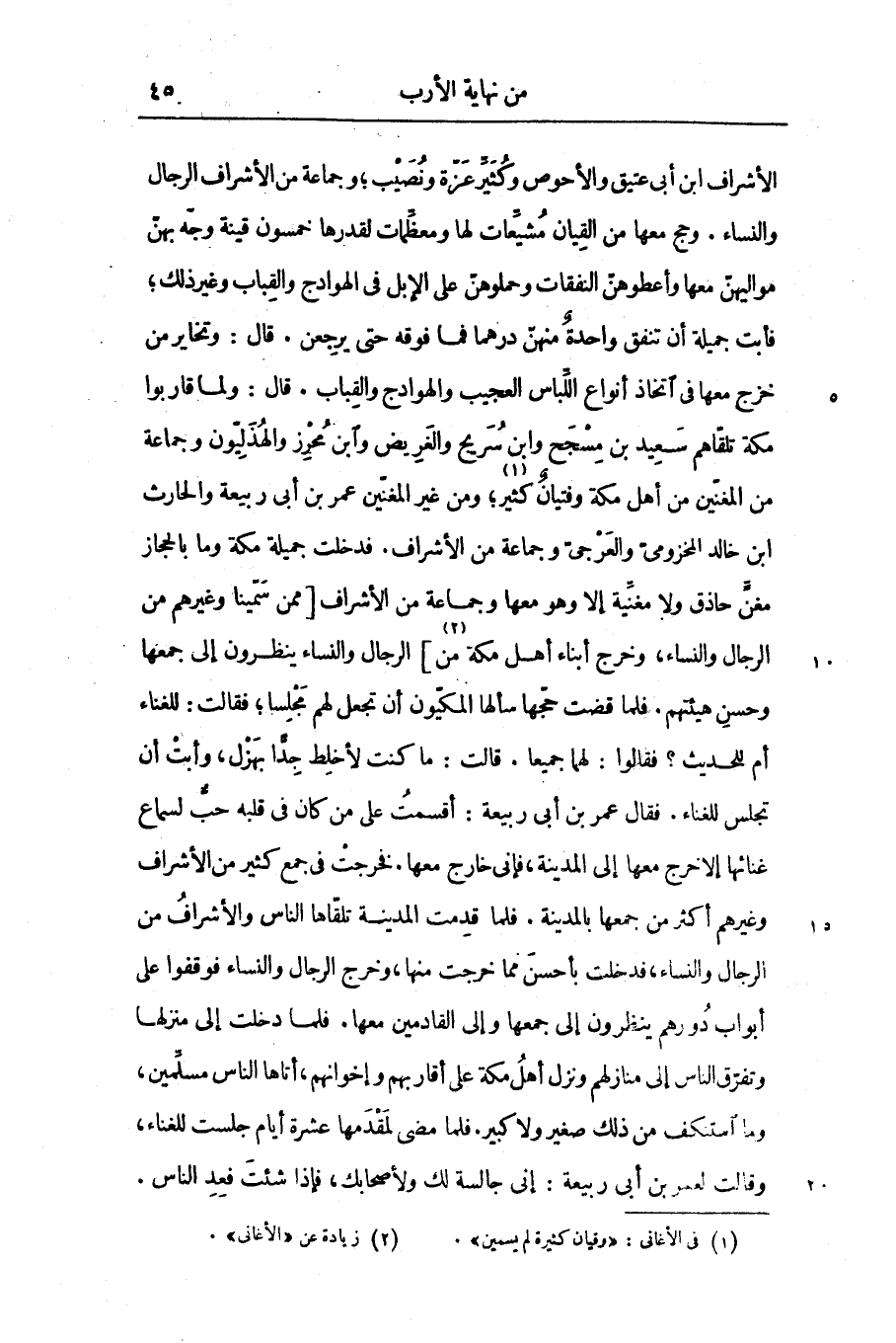 الأشراف ابن أبى عتيق والأحوص وكثيّر عزّة ونصيب؛ وجماعة من الأشراف الرجال والنساء. وحج معها من القيان مشيّعات لها ومعظّمات لقدرها خمسون قينة وجّه بهنّ مواليهنّ معها وأعطوهنّ النفقات وحملوهنّ على الإبل فى الهوادج والقباب وغير ذلك؛ فأبت جميلة أن تنفق واحدة منهنّ درهما فما فوقه حتى يرجعن. قال: وتخاير من خزج معها فى اتخاذ أنواع اللّباس العجيب والهوادج والقباب. قال: ولما قاربوا مكة تلقّاهم سعيد بن مسجح وابن سريج والغريض وابن محرز والهذليّون وجماعة من المغنّين من أهل مكة وفتيان كثير [1] ؛ ومن غير المغنّين عمر بن أبى ربيعة والحارث ابن خالد المخزومىّ والعرجىّ وجماعة من الأشراف. فدخلت جميلة مكة وما بالحجاز مغنّ حاذق ولا مغنيّة إلا وهو معها وجماعة من الأشراف [ممن سمّينا وغيرهم من الرجال والنساء، وخرج أبناء أهل مكة من [2]] الرجال والنساء ينظرون إلى جمعها وحسن هيئتهم. فلما قضت حجّها سألها المكيّون أن تجعل لهم مجلسا؛ فقالت: للغناء أم للحديث؟ فقالوا: لهما جميعا. قالت: ما كنت لأخلط جدّا بهزل، وأبت أن تجلس للغناء. فقال عمر بن أبى ربيعة: أقسمت على من كان فى قلبه حبّ لسماع غنائها إلا خرج معها إلى المدينة، فإنى خارج معها. فخرجت فى جمع كثير من الأشراف وغيرهم أكثر من جمعها بالمدينة. فلما قدمت المدينة تلقّاها الناس والأشراف من الرجال والنساء، فدخلت بأحسن مما خرجت منها، وخرج الرجال والنساء فوقفوا على أبواب دورهم ينظرون إلى جمعها وإلى القادمين معها. فلما دخلت إلى منزلها وتفرّق الناس إلى منازلهم ونزل أهل مكة على أقاربهم وإخوانهم، أتاها الناس مسلّمين، وما استنكف من ذلك صغير ولا كبير. فلما مضى لمقدمها عشرة أيام جلست للغناء، وقالت لعمر بن أبى ربيعة: إنى جالسة لك ولأصحابك، فإذا شئت فعد الناس.