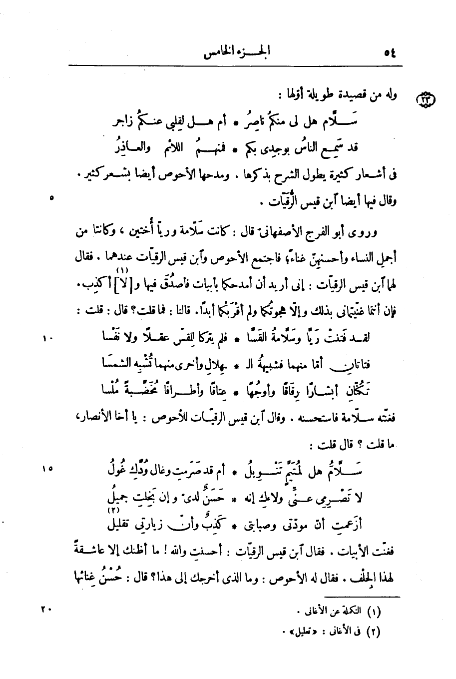 فغنّت الأبيات. فقال ابن قيس الرقيّات: أحسنت والله! ما أظنك إلا عاشقة لهذا الجلف. فقال له الأحوص: وما الذى أخرجك إلى هذا؟ قال: حسن غنائها