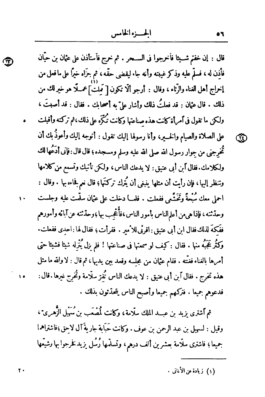 قال: إن خفتم شيئا فاخرجوا فى السحر. ثم خرج فاستأذن على عثمان بن حيّان فأذن له، فسلّم عليه وذكر غيبته وأنه جاء ليقضى حقّه، ثم جزاه خيرا على ما فعل من إخراج أهل الغناء والرّثاء، وقال: أرجو ألّا تكون [عملت [1]] عملا هو خير لك من ذلك. قال عثمان: قد فعلت ذلك وأشار علىّ به أصحابك. فقال: قد أصبت، ولكن ما تقول فى امرأة كانت هذه صناعتها وكانت تكره على ذلك، ثم تركته وأقبلت على الصلاة والصيام والخير، وأنا رسولها إليك تقول: أتوجه إليك وأعوذ بك أن تخرجنى من جوار رسول الله صلى الله عليه وسلم ومسجده؛ قال قال: فإنى أدعها لك ولكلامك. فقال ابن أبى عتيق: لا يدعك الناس، ولكن تأتيك وتسمع من كلامها وتنظر إليها، فإن رأيت أن مثلها ينبغى أن يترك تركتها؛ قال نعم فجاءه بها. وقال: