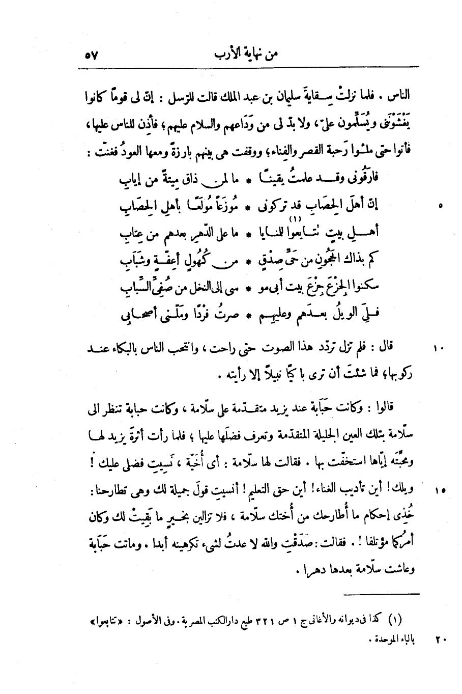 الناس. فلما نزلت سقاية سليمان بن عبد الملك قالت للرّسل: إنّ لى قوما كانوا يغشوننى ويسلّمون علىّ، ولا بدّ لى من وداعهم والسلام عليهم؛ فأذن للناس عليها، فأتوا حتى ملؤا رحبة القصر والفناء؛ ووقفت هى بينهم بارزة ومعها العود فغنّت:
