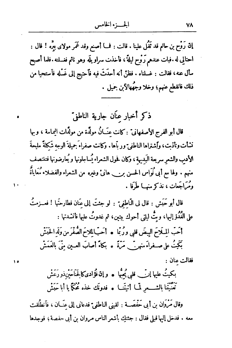 وقال مروان بن أبى حفصة: لقينى الناطفىّ فدعانى إلى عنان، فانطلقت معه. فدخل إليها قبلى فقال: جئتك بأشعر الناس مروان بن أبى حفصة؛ فوجدها