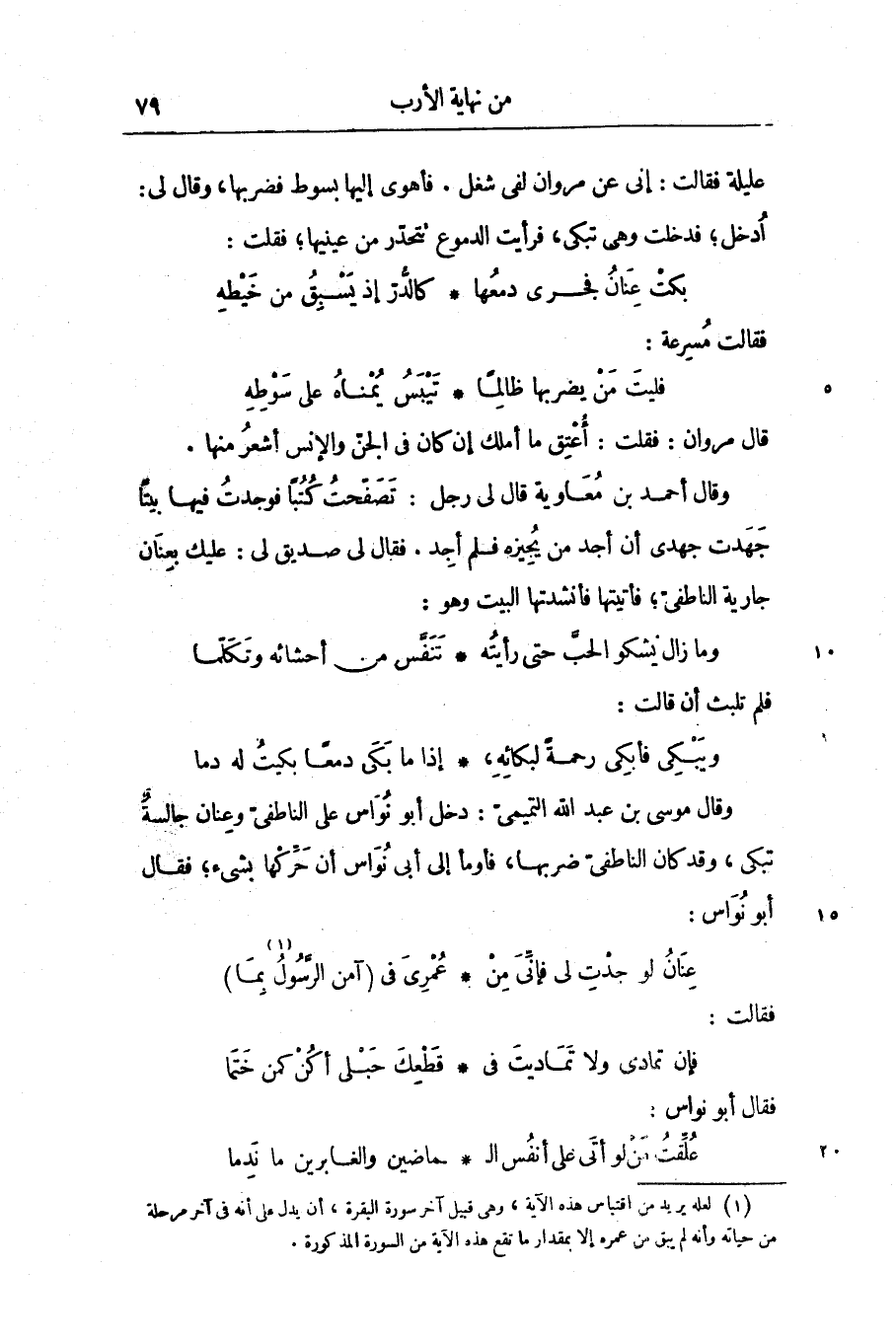 وقال موسى بن عبد الله التميمىّ: دخل أبو نواس على الناطفىّ وعنان جالسة تبكى، وقد كان الناطفىّ ضربها، فأومأ إلى أبى نواس أن حرّكها بشىء؛ فقال أبو نواس: