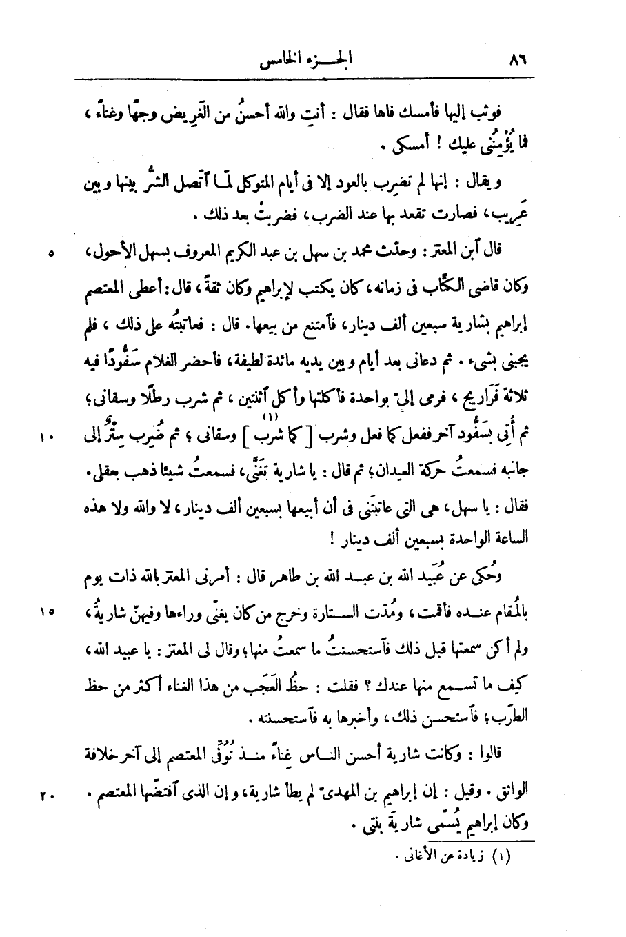 قال ابن المعتز: وحدّث محمد بن سهل بن عبد الكريم المعروف بسهل الأحول، وكان قاضى الكتّاب فى زمانه، كان يكتب لإبراهيم وكان ثقة، قال: أعطى المعتصم إبراهيم بشارية سبعين ألف دينار، فامتنع من بيعها. قال: فعاتبته على ذلك، فلم يجبنى بشىء. ثم دعانى بعد أيام وبين يديه مائدة لطيفة، فأحضر الغلام سفّودا فيه ثلاثة فراريج، فرمى إلىّ بواحدة فأكلتها وأكل اثنتين، ثم شرب رطلا وسقانى؛ ثم أتى بسفّود آخر ففعل كما فعل وشرب [كما شرب [1]] وسقانى؛ ثم ضرب ستر إلى جانبه فسمعت حركة العيدان؛ ثم قال: يا شارية تغنّى، فسمعت شيئا ذهب بعقلى.