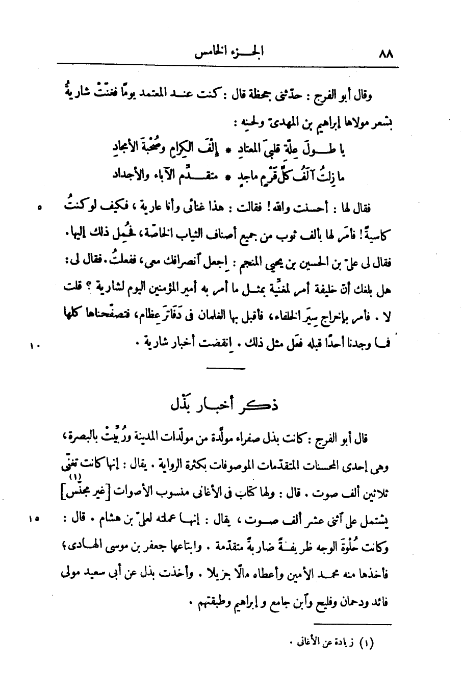 قال أبو الفرج: كانت بذل صفراء مولّدة من مولّدات المدينة وربّيت بالبصرة، وهى إحدى المحسنات المتقدّمات الموصوفات بكثرة الرواية. يقال: إنها كانت تغنّى ثلاثين ألف صوت. قال: ولها كتاب فى الأغانى منسوب الأصوات [غير مجنّس [1]] يشتمل على اثنى عشر ألف صوت، يقال: إنها عملته لعلىّ بن هشام. قال: