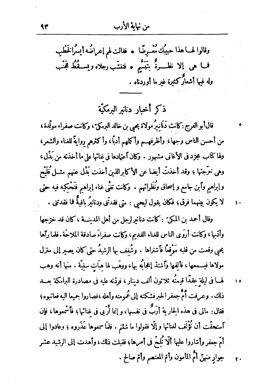 وقال أحمد بن المكىّ: كانت دنانير لرجل من أهل المدينة، كان قد خرّجها وأدّبها، وكانت أروى الناس للغناء القديم، وكانت صفراء صادقة الملاحة. فلما رآها يحيى وقعت من قلبه موقعا فاشتراها. وشغف بها الرشيد حتى كان يصير إلى منزل مولاها فيسمعها، فألفها واشتدّ إعجابه بها، ووهب لها هبات سنيّة. منها أنه وهب لها فى ليلة عقدا قيمته ثلاثون ألف دينار، فردّته عليه فى مصادرة البرامكة بعد ذلك. وعرفت أمّ جعفر الخبر فشكته إلى عمومته وأهله، فصاروا جميعا اليه فعاتبوه؛ فقال: مالى فى هذه الجارية أرب فى نفسها، وإنما أربى فى غنائها؛ فاسمعوها، فإن استحقّت أن تؤلف لغنائها وإلّا فقولوا ما شئتم. فلمّا سمعوها عذروه؛ وعادوا إلى أمّ جعفر وأشاروا عليها ألّا تلحّ فى أمرها؛ فقبلت ذلك، وأهدت إلى الرشيد عشر جوار منهنّ أمّ المأمون وأمّ المعتصم وأمّ صالح.