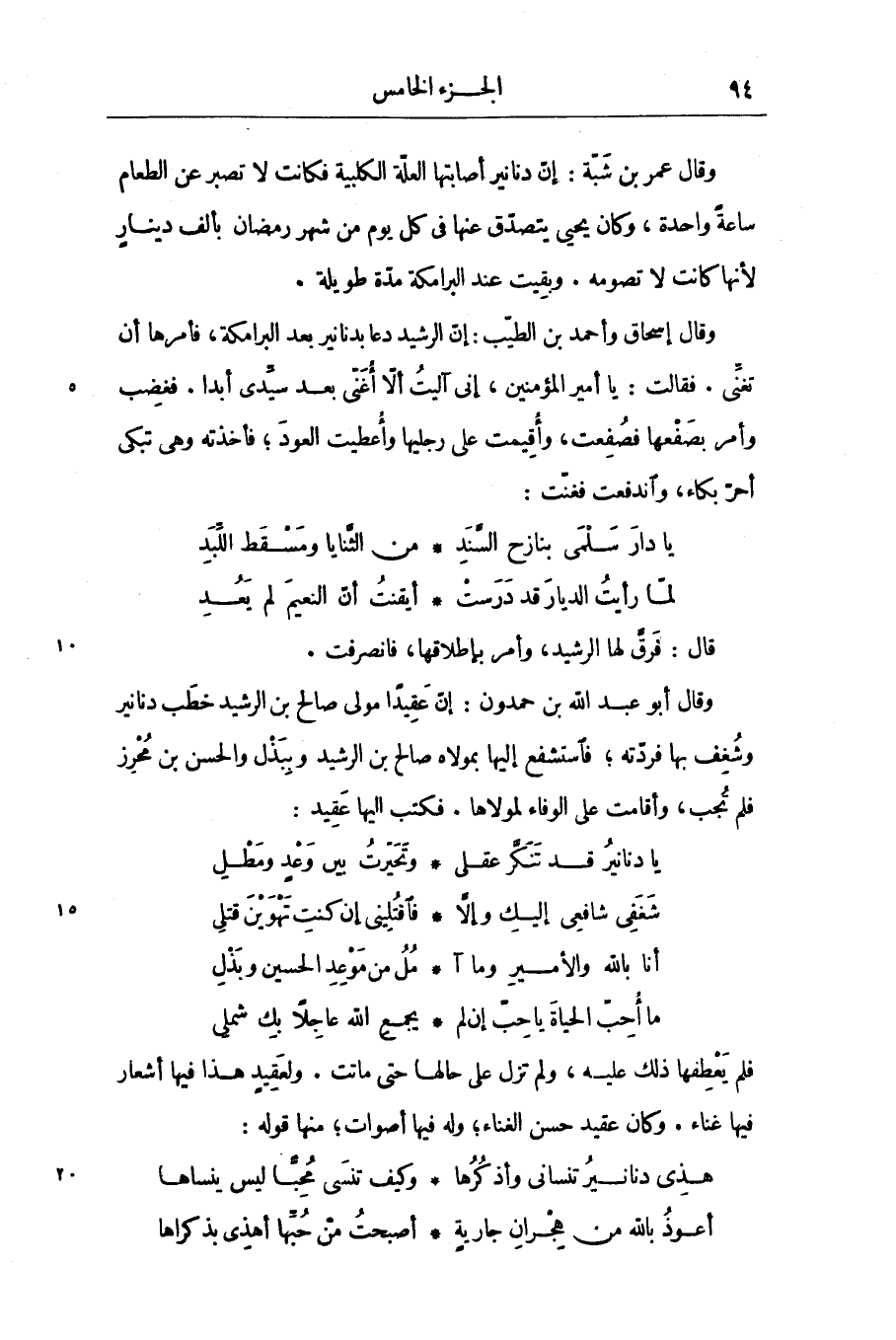 وقال أبو عبد الله بن حمدون: إنّ عقيدا مولى صالح بن الرشيد خطب دنانير وشغف بها فردّته؛ فاستشفع إليها بمولاه صالح بن الرشيد وببذل والحسن بن محرز فلم تجب، وأقامت على الوفاء لمولاها. فكتب اليها عقيد: