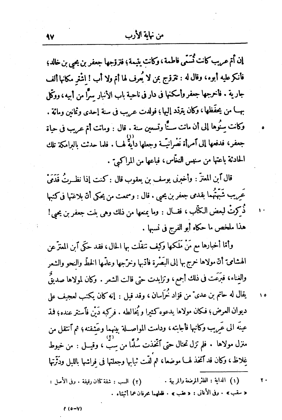 وكانت سنوها إلى أن ماتت ستّا وتسعين سنة. قال: وماتت أمّ عريب فى حياة جعفر، فدفعها إلى امرأة نصرانيّة وجعلها داية [1] لها. فلما حدثت بالبرامكة تلك الحادثة باعتها من سنبس النخّاس، فباعها من المراكبىّ.
