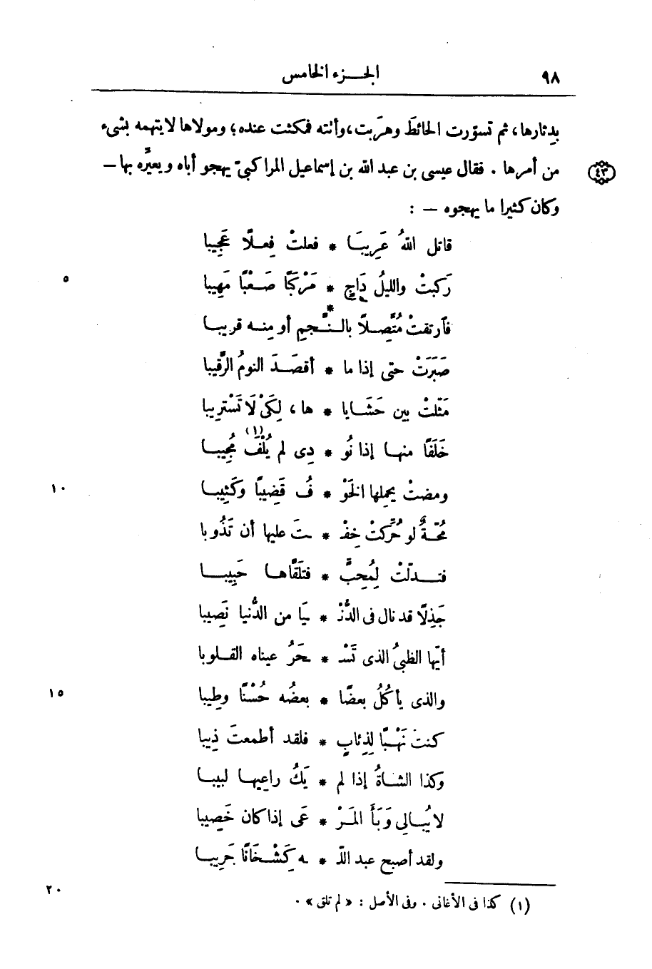 بدثارها، ثم تسوّرت الحائط وهربت، وأتته فمكثت عنده؛ ومولاها لا يتهمه بشىء من أمرها. فقال عيسى بن عبد الله بن إسماعيل المراكبىّ يهجو أباه ويعيّره بها- وكان كثيرا ما يهجوه-: