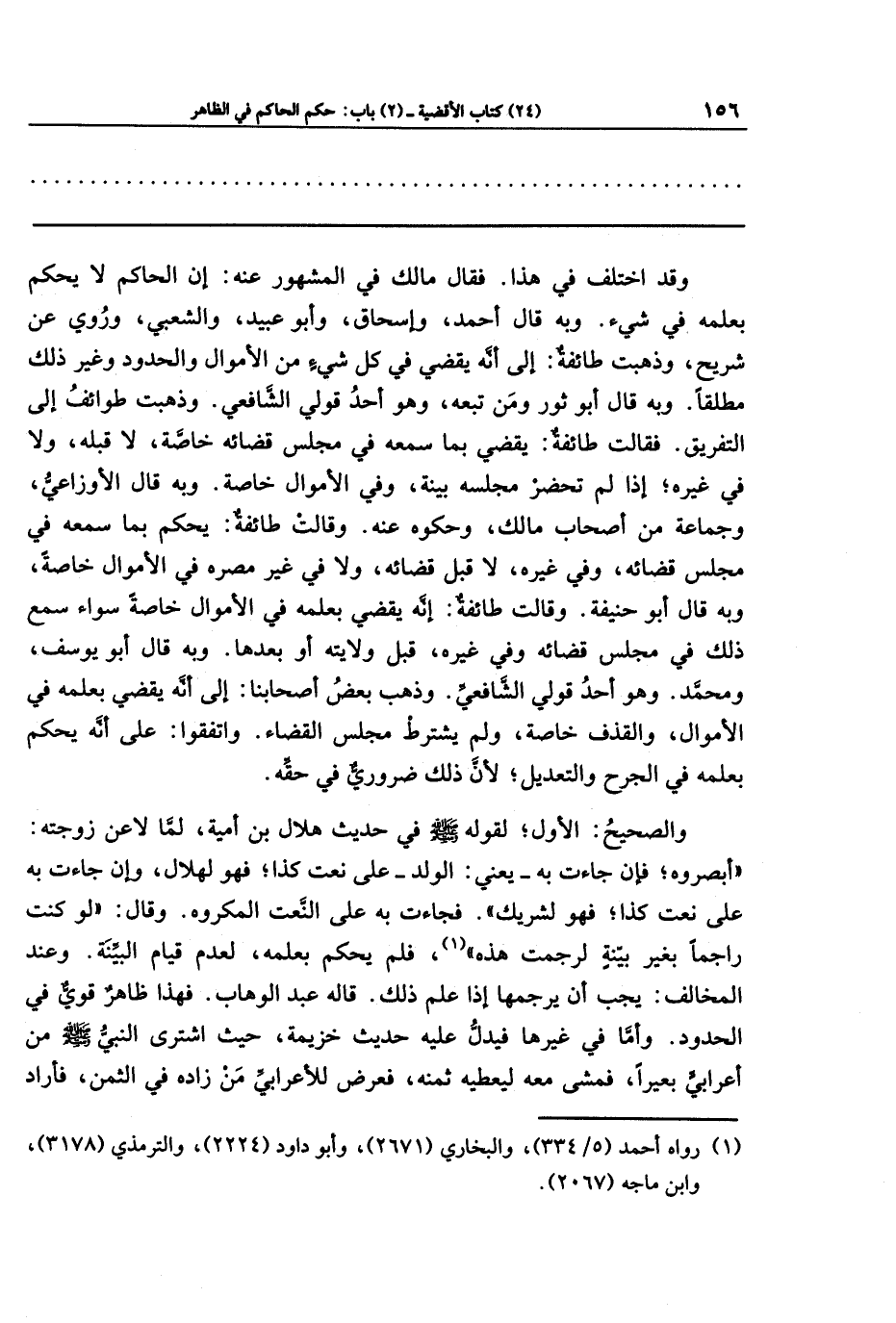 والصحيح: الأول؛ لقوله - صلى الله عليه وسلم - في حديث هلال بن أمية، لَمَّا لاعن زوجته: (أبصروه؛ فإن جاءت به - يعني: الولد - على نعت كذا؛ فهو لهلال، وإن جاءت به على نعت كذا؛ فهو لشريك). فجاءت به على النعت المكروه. وقال: (لو كنت راجمًا بغير بيِّنة لرجمت هذه) (¬1)، فلم يحكم بعلمه، لعدم قيام البينة. وعند المخالف: يجب أن يرجمها إذا علم ذلك. قاله عبد الوهاب. فهذا ظاهرٌ قوي في الحدود. وأمَّا في غيرها فيدلّ عليه حديث خزيمة، حيث اشترى النبي - صلى الله عليه وسلم - من أعرابي بعيرًا، فمشى معه ليعطيه ثمنه، فعرض للأعرابي من زاده في الثمن، فأراد