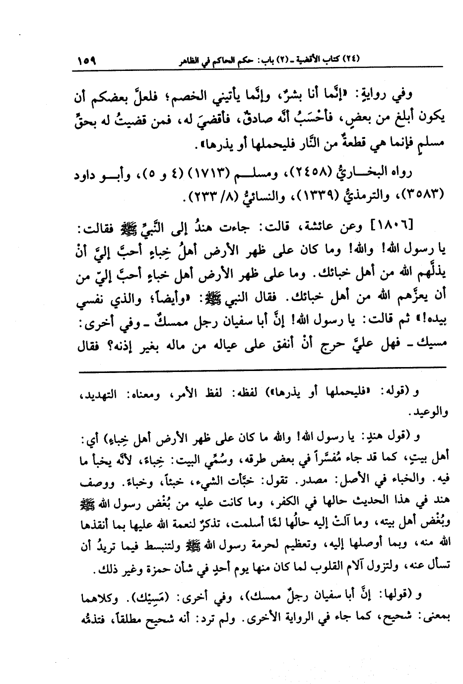 [1806] وعَن عَائِشَةَ قَالَت: جَاءَت هِندٌ إِلَى النَّبِيِّ صَلَّى اللَّهُ عَلَيهِ وَسَلَّمَ فَقَالَت: يَا رَسُولَ اللَّهِ، وَاللَّهِ! ومَا كَانَ عَلَى ظَهرِ الأَرضِ أَهلُ خِبَاءٍ أَحَبَّ إِلَيَّ أَن يُذِلَّهُم اللَّهُ مِن أَهلِ خِبَائِكَ، وَمَا عَلَى ظَهرِ الأَرضِ أَهلُ خِبَاءٍ أَحَبَّ إِلَيَّ مِن أَن يُعِزَّهُم اللَّهُ مِن أَهلِ خِبَائِكَ، فَقَالَ النَّبِيُّ صَلَّى اللهُ عَلَيهِ وَسَلَّمَ: وَأَيضًا، وَالَّذِي نَفسِي بِيَدِهِ. ثُمَّ قَالَت: يَا رَسُولَ اللَّهِ! إِنَّ أَبَا سُفيَانَ رَجُلٌ مُمسِكٌ - وفي أخرى: مسيك - فَهَل عَلَيَّ حَرَجٌ أَن أُنفِقَ عَلَى عِيَالِهِ مِن مَالِهِ بِغَيرِ إِذنِهِ؟ فَقَالَ