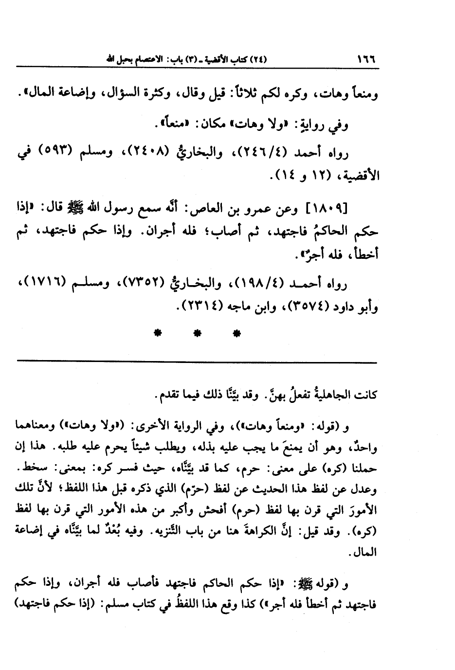 [1809] وعَن عَمرِو بنِ العَاصِ: أَنَّهُ سَمِعَ رَسُولَ اللَّهِ صَلَّى اللَّهُ عَلَيهِ وَسَلَّمَ قَالَ: إِذَا حَكَمَ الحَاكِمُ فَاجتَهَدَ ثُمَّ أَصَابَ فَلَهُ أَجرَانِ، وَإِذَا حَكَمَ فَاجتَهَدَ ثُمَّ أَخطَأَ فَلَهُ أَجرٌ.