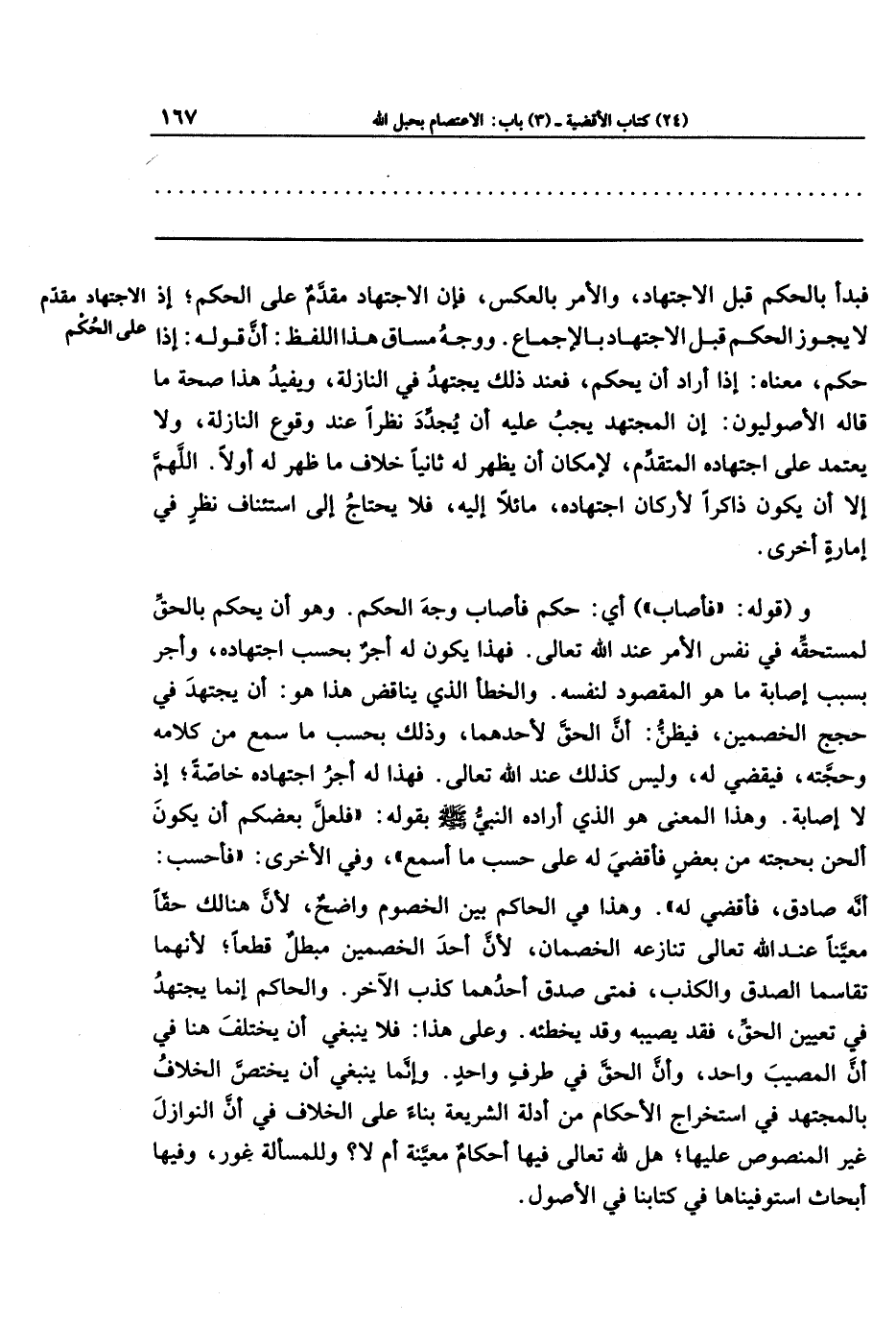 فبدأ بالحكم قبل الاجتهاد، والأمر بالعكس، فإنَّ الاجتهاد مقدَّمٌ على الحكم؛ إذ لا يجوز الحكم قبل الاجتهاد بالإجماع. ووجهُ مساق هذا اللفظ: أن قوله: (إذا حكم) معناه: إذا أراد أن يحكم، فعند ذلك يجتهد في النازلة، ويفيد هذا صحة ما قاله الأصوليون: إن المجتهد يجب عليه أن يجدد نظرا عند وقوع النازلة، ولا يعتمد على اجتهاده المتقدم، لإمكان أن يظهر له ثانيًا خلاف ما ظهر له أولًا. اللهم إلا أن يكون ذاكرًا لأركان اجتهاده، مائلًا إليه، فلا يحتاج إلى استئناف نظر في إمارة أخرى.