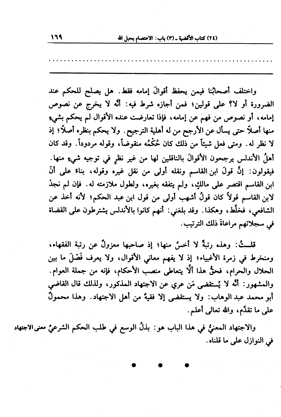 واختلف أصحابنا فيمن يحفظ أقوال إمامه فقط. هل يصلح للحكم عند الضرورة أو لا؟ على قولين؟ فمن أجازه شرط فيه: أنَّه لا يخرج عن نصوص إمامه، أو نصوص من فهم عن إمامه، فإذا تعارضت عنده الأقوال لم يحكم بشيء منها أصلًا حتى يسأل عن الأرجح من له أهلية الترجيح. ولا يحكم بنظره أصلًا؛ إذ لا نظر له. ومتى فعل شيئًا من ذلك كان حكمه منقوضًا، وقوله مردودًا. وقد كان أهل الأندلس يرجحون الأقوال بالناقلين لها من غير نظر في توجيه شيء منها. فيقولون: إن قول ابن القاسم ونقله أولى من نقل غيره وقوله، بناءً على أن ابن القاسم اقتصر على مالك، ولم يتفقَّه بغيره، ولطول ملازمته له. فإن لم نجد لابن القاسم قولًا كان قول أشهب أولى من قول ابن عبد الحكم؛ لأنَّه أخذ عن الشافعي، فخلَّط، وهكذا. وقد بلغني: أنهم كانوا بالأندلس يشترطون على القضاة في سجلاتهم مراعاة ذلك الترتيب.