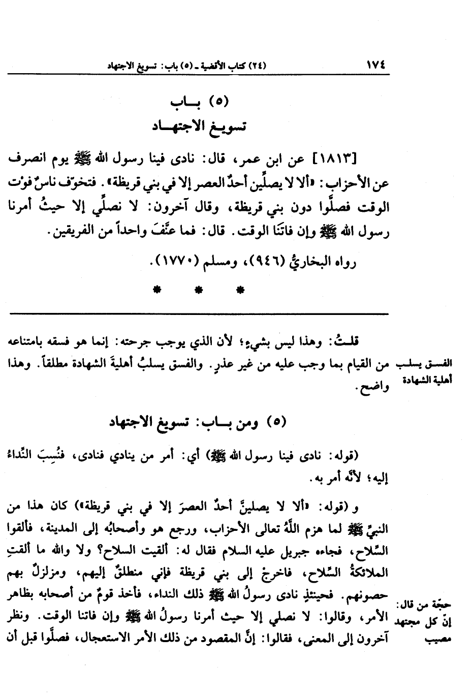 [1813] عَن ابن عمر قَالَ: نَادَى فِينَا رَسُولُ اللَّهِ صَلَّى اللَّهُ عَلَيهِ وَسَلَّمَ يَومَ انصَرَفَ عَن الأَحزَابِ: أَلَا لا يُصَلِّيَنَّ أَحَدٌ العصر إِلَّا فِي بَنِي قُرَيظَةَ. فَتَخَوَّفَ نَاسٌ فَوتَ الوَقتِ، فَصَلَّوا دُونَ بَنِي قُرَيظَةَ، وَقَالَ آخَرُونَ: لَا نُصَلِّي إِلَّا حَيثُ أَمَرَنَا رَسُولُ اللَّهِ صَلَّى اللهُ عَلَيهِ وَسَلَّمَ، وَإِن فَاتَنَا الوَقتُ. قَالَ: فَمَا عَنَّفَ وَاحِدًا مِن الفَرِيقَينِ.