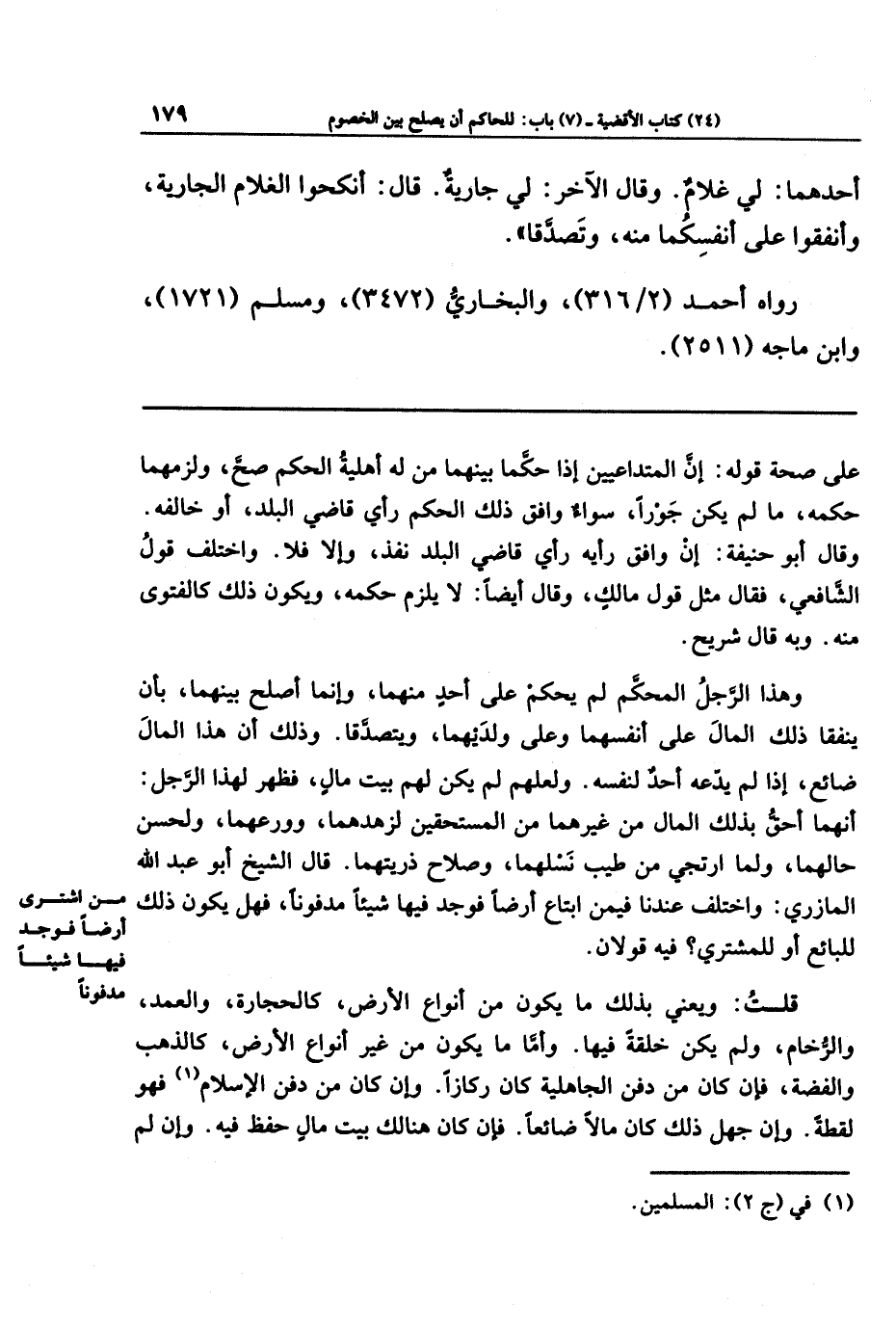 قال الشيخ أبو عبد الله المازري: واختلف عندنا فيمن ابتاع أرضًا فوجد فيها شيئًا مدفونًا؛ فهل يكون ذلك للبائع أو للمشتري؛ فيه قولان.