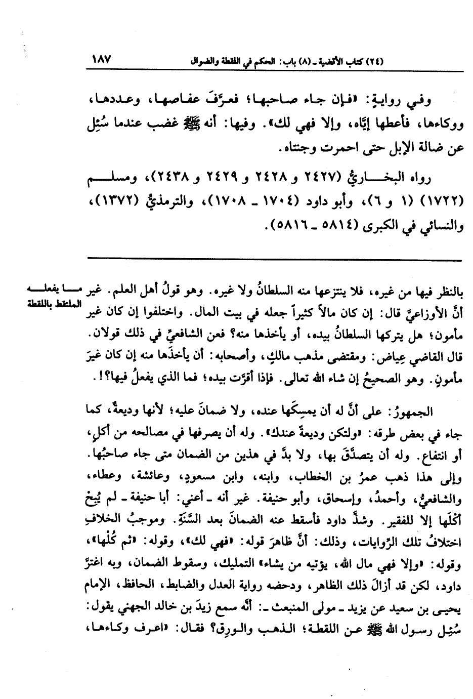 وموجب الخلاف اختلاف تلك الروايات، وذلك: أن ظاهر قوله: (فهي لك)، و (قوله: ثم كُلها)، و (قوله: وإلا فهي مال الله يؤتيه من يشاء): التمليك، وسقوط الضمان، وبه اغتَرَّ داود، لكن قد أزال ذلك الظاهر، ودَحَضَه رواية العدل والضابط الحافظ الإمام يحيى بن سعيد عن يزيد - مولى المنبعث -: أنَّه سمع زيد بن خالد الجهني يقول: سُئل رسول الله - صلى الله عليه وسلم - عن اللقطة؛ الذهب والورق فقال: (اعرف وكاءها،