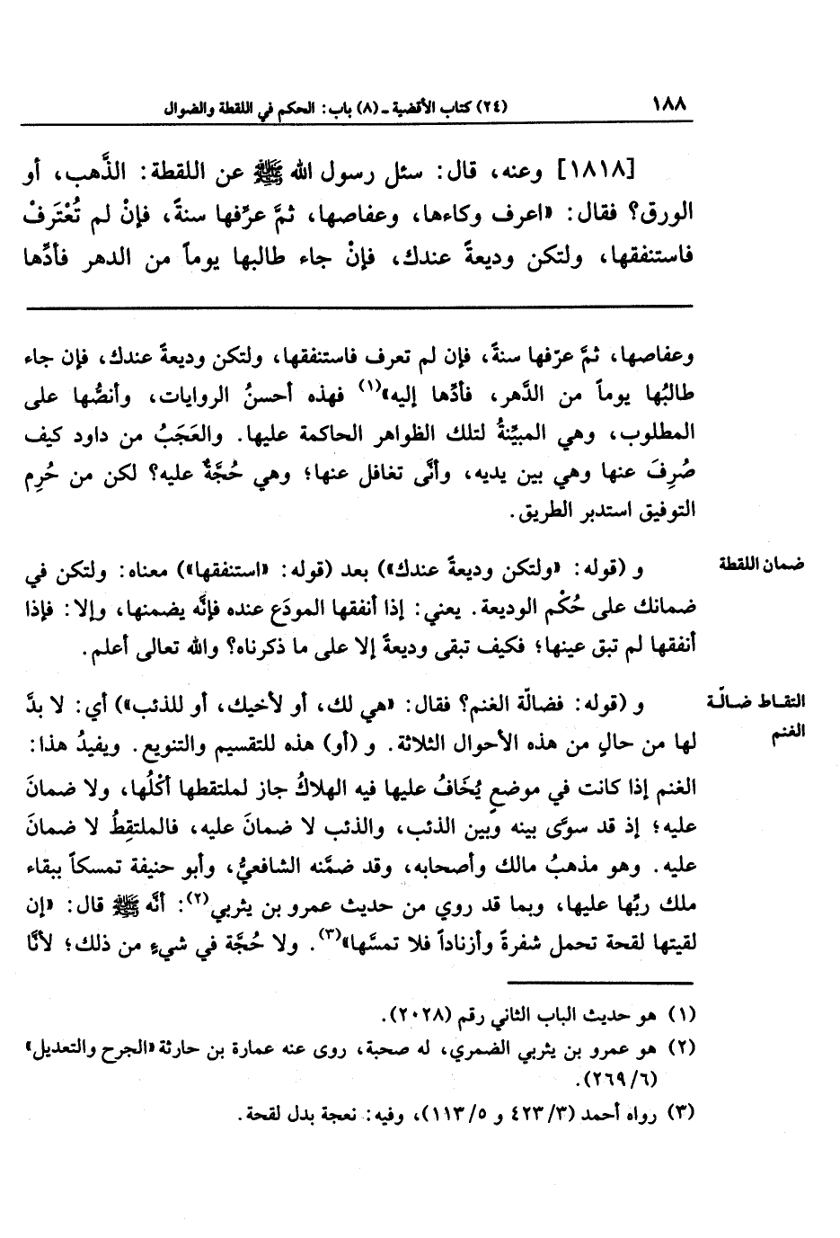 [1818] وعنه، قال: سُئِلَ رَسُولُ اللَّهِ صَلَّى اللَّهُ عَلَيهِ وَسَلَّمَ عَن اللُّقَطَةِ: الذَّهَبِ أَو الوَرِقِ، فَقَالَ: اعرِف وِكَاءَهَا وَعِفَاصَهَا، ثُمَّ عَرِّفهَا سَنَةً، فَإِن لَم تَعترِف فَاستَنفِقهَا، وَلتَكُن وَدِيعَةً عِندَكَ، فَإِن جَاءَ طَالِبُهَا يَومًا مِن الدَّهرِ فَأَدِّهَا