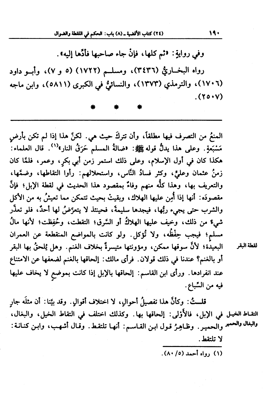 وهل يلحق بها البقر أو بالغنم؟ عندنا في ذلك قولان. فرأى مالك إلحاقها بالغنم لضعفها عن الامتناع عند انفرادها. ورأى ابن القاسم إلحاقها بالإبل إذا كانت بموضع لا يخاف عليها فيه من السِّباع.