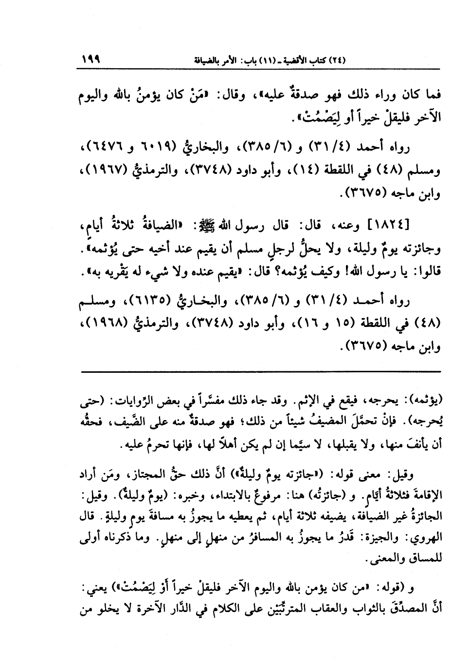 [1824] وعنه، قَالَ: قَالَ رَسُولُ اللَّهِ صَلَّى اللهُ عَلَيهِ وَسَلَّمَ: الضِّيَافَةُ ثَلَاثَةُ أَيَّامٍ، وَجَائِزَتُهُ يَومٌ وَلَيلَةٌ، وَلَا يَحِلُّ لِرَجُلٍ مُسلِمٍ أَن يُقِيمَ عِندَ أَخِيهِ حَتَّى يُؤثِمَهُ. قَالَوا: يَا رَسُولَ اللَّهِ، وَكَيفَ يُؤثِمُهُ؟ قَالَ: يُقِيمُ عِندَهُ وَلَا شَيءَ لَهُ يَقرِيهِ بِهِ.
