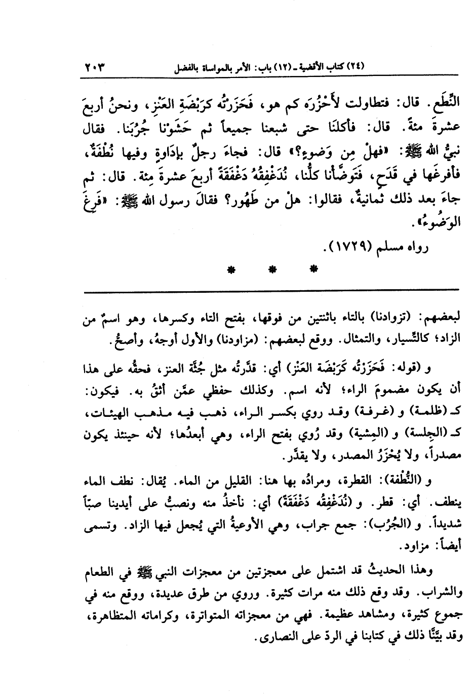 وهذا الحديث قد اشتمل على معجزتين من معجزات النبي - صلى الله عليه وسلم - في الطعام والشراب. وقد وقع ذلك منه مرات كثيرة. وروي من طرق عديدة، ووقع منه في جموع كثيرة، ومشاهد عظيمة؛ فهي من معجزاته المتواترة، وكراماته المتظاهرة، وقد بيَّنَّا ذلك في كتابنا في الردِّ على النصارى.