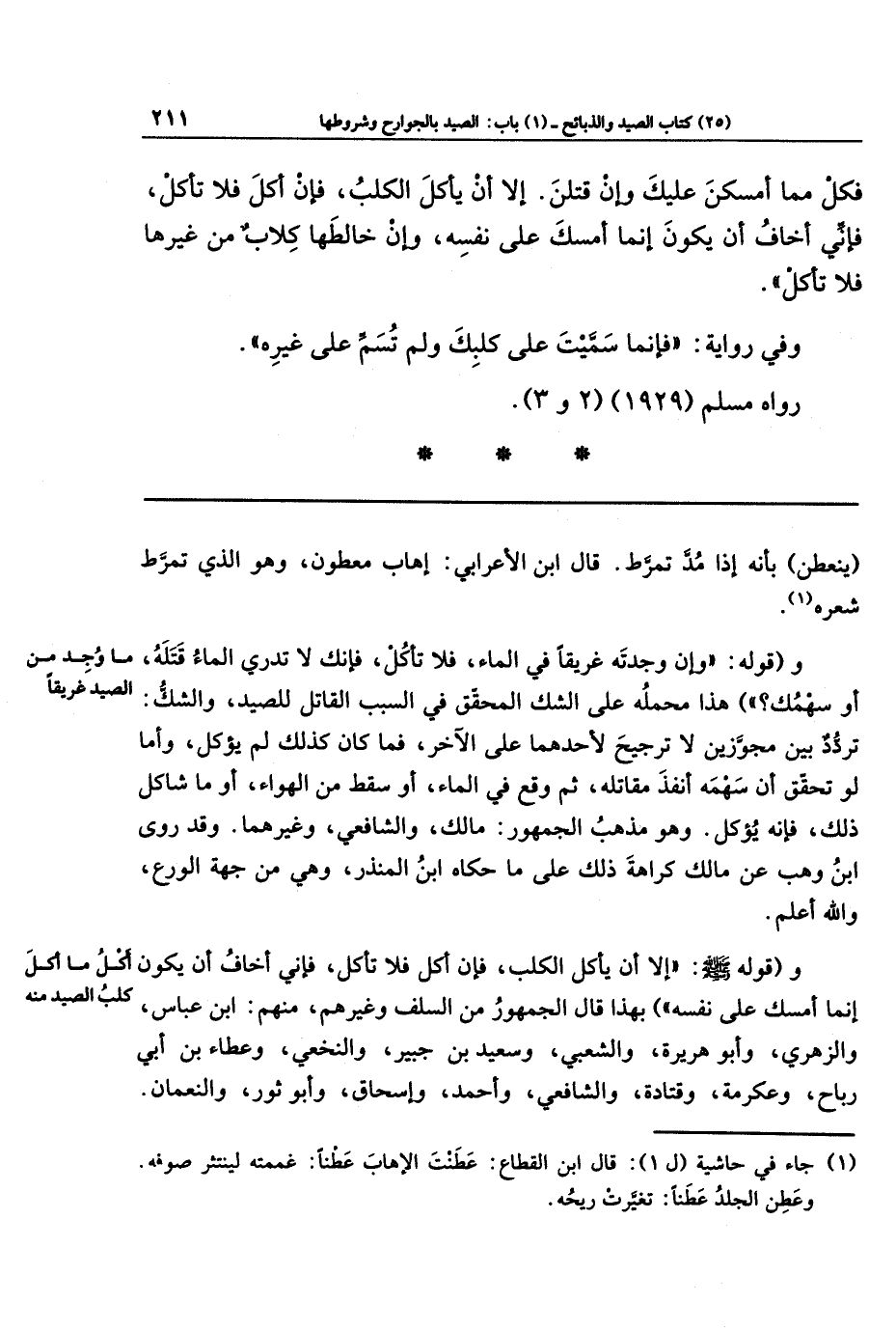 وقوله - صلى الله عليه وسلم -: (إلا أن يأكل الكلب، فإن أكل فلا تأكل، فإني أخاف أن يكون إنما أمسك على نفسه) بهذا قال الجمهور من السلف وغيرهم، منهم: ابن عباس، والزهري، وأبو هريرة، والشعبي، وسعيد بن جبير، والنخعي، وعطاء بن أبي رباح، وعكرمة، وقتادة، والشافعي، وأحمد، وإسحاق، وأبو ثور، والنعمان.