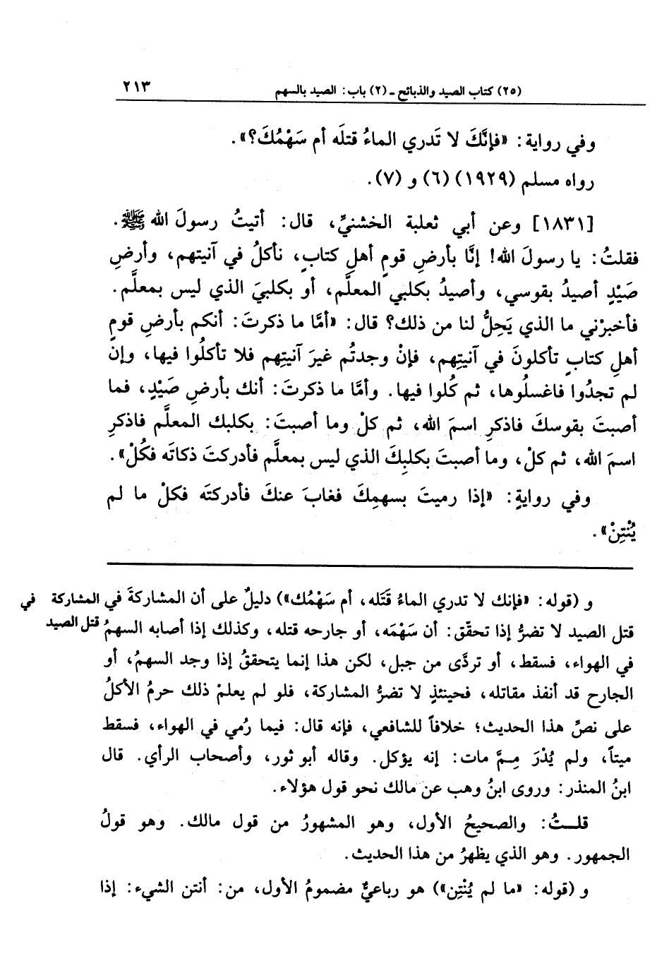 [1831] وعن أَبِي ثَعلَبَةَ الخُشَنِيِّ قَالَ: أَتَيتُ رَسُولَ اللَّهِ - صَلَّى اللَّهُ عَلَيهِ وَسَلَّمَ - فَقُلتُ: يَا رَسُولَ اللَّهِ، إِنَّا بِأَرضِ قَومٍ أَهلِ كِتَابِ، نَأكُلُ فِي آنِيَتِهِم، وَأَرضِ صَيدٍ أَصِيدُ بِقَوسِي، وَأَصِيدُ بِكَلبِي المُعَلَّمِ، أَو بِكَلبِي الَّذِي لَيسَ بِمُعَلَّمٍ، فَأَخبِرنِي مَا الَّذِي يَحِلُّ لَنَا مِن ذَلِكَ؟ قَالَ: أَمَّا مَا ذَكَرتَ أَنَّكُم بِأَرضِ قَومٍ أَهلِ كِتَابِ تَأكُلُونَ فِي آنِيَتِهِم، فَإِن وَجَدتُم غَيرَ آنِيَتِهِم فَلَا تَأكُلُوا فِيهَا، وَإِن لَم تَجِدُوا فَاغسِلُوهَا ثُمَّ كُلُوا فِيهَا، وَأَمَّا مَا ذَكَرتَ أَنَّكَ بِأَرضِ صَيدٍ، فَمَا أَصَبتَ بِقَوسِكَ فَاذكُر اسمَ اللَّهِ ثُمَّ كُل، وَمَا أَصَبتَ بِكَلبِكَ المُعَلَّمِ فَاذكُر اسمَ اللَّهِ ثُمَّ كُل، وَمَا أَصَبتَ بِكَلبِكَ الَّذِي لَيسَ بِمُعَلَّمٍ فَأَدرَكتَ ذَكَاتَهُ فَكُل.