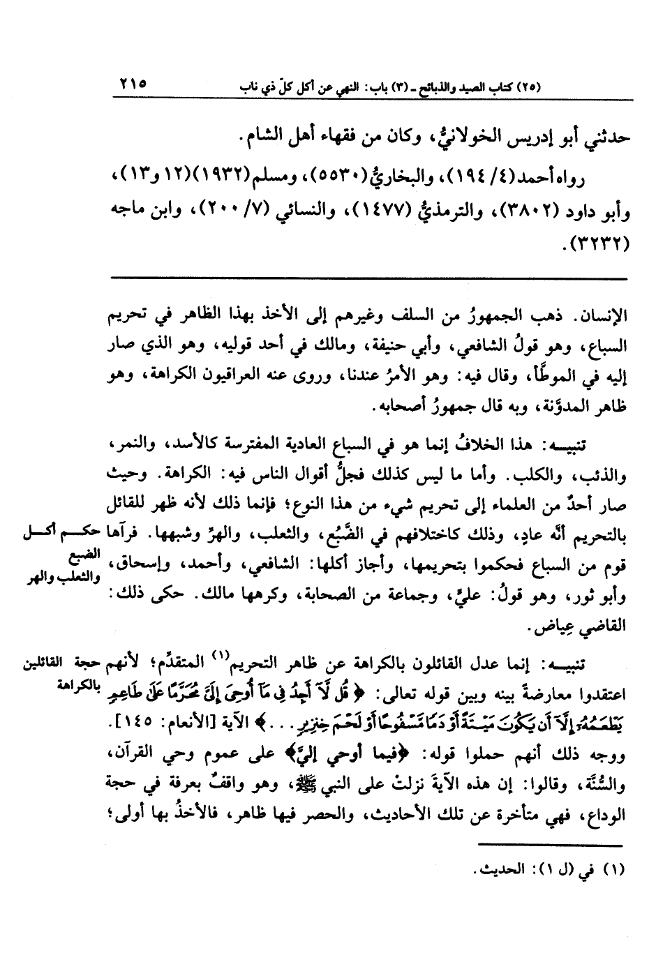 الأسنان. ذهب الجمهور من السَّلف وغيرهم إلى الأخذ بهذا الظاهر في تحريم السباع، وهو قول الشافعي، وأبي حنيفة، ومالك في أحد قوليه، وهو الذي صار إليه في الموطأ، وقال فيه: وهو الأمر عندنا، وروى عنه العراقيون الكراهة، وهو ظاهر المدوَّنة، وبه قال جمهور أصحابه.