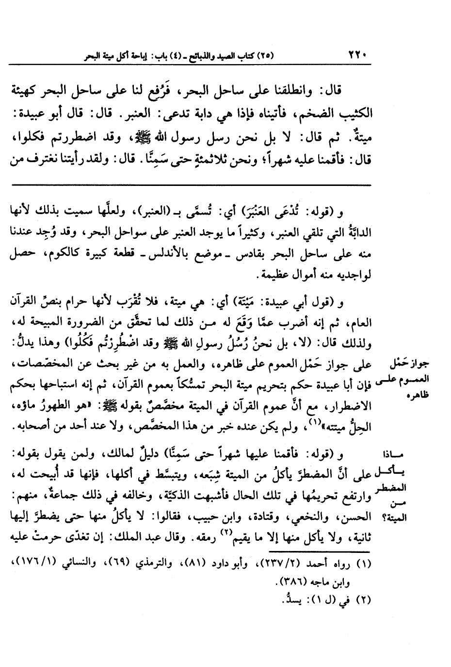 و(قول أبي عبيدة: مَيتَة) أي: هي مَيتَة، فلا تُقرب؛ لأنَّها حرام بنصِّ القرآن العام، ثم إنه أضرب عمَّا وقع له من ذلك لما تحقق من الضرورة المبيحة له، ولذلك قال: (لا، بل نحن رسل رسول الله - صلى الله عليه وسلم - وقد اضطررتم فكلوا) وهذا يدلّ على جواز حمل العموم على ظاهره، والعمل به من غير بحث عن المخصِّصات، فإن أبا عبيدة حكم بتحريم ميتة البحر تمسُّكًا بعموم القرآن، ثم إنه استباحها بحكم الاضطرار، مع أن عموم القرآن في الميتة مخصَّصٌ بقوله - صلى الله عليه وسلم -: (هو الطهور ماؤه، الحل ميتته) (¬1)، ولم يكن عنده خبر من هذا المخصِّص، ولا عند أحد من أصحابه.