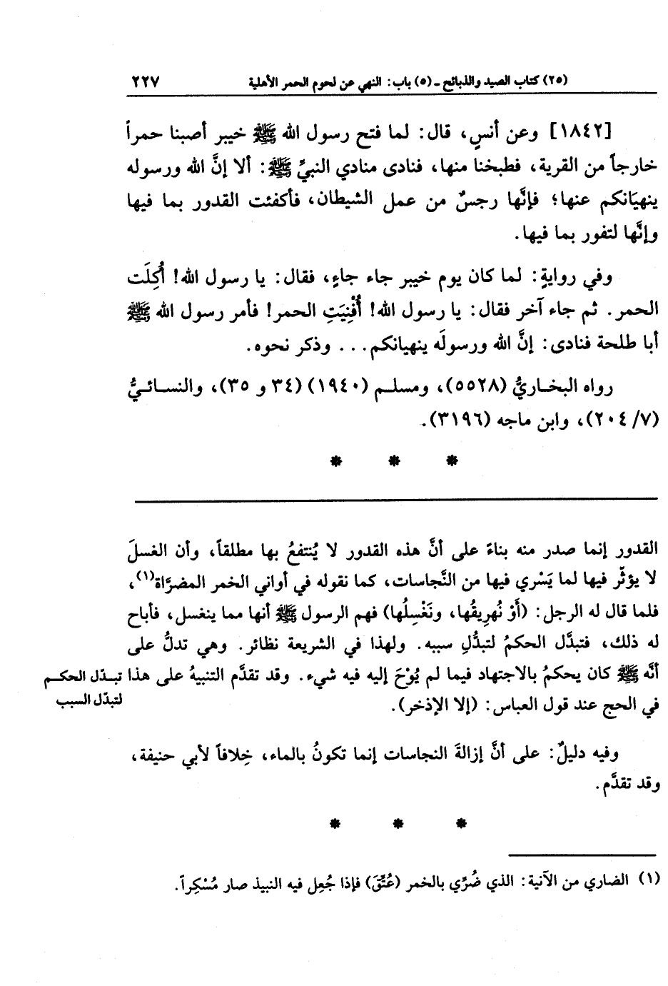 [1842] وعَن أَنَسٍ قَالَ: لَمَّا فَتَحَ رَسُولُ اللَّهِ صَلَّى اللَّهُ عَلَيهِ وَسَلَّمَ خَيبَرَ أَصَبنَا حُمُرًا خَارِجًا مِن القَريَةِ، فَطَبَخنَا مِنهَا، فَنَادَى مُنَادِي النبي صَلَّى اللهُ عَلَيهِ وَسَلَّمَ: أَلَا إِنَّ اللَّهَ وَرَسُولَهُ يَنهَيَانِكُم عَنهَا؛ فَإِنَّهَا رِجسٌ مِن عَمَلِ الشَّيطَانِ. فَأُكفِئَت القُدُورُ بِمَا فِيهَا، وَإِنَّهَا لَتَفُورُ بِمَا فِيهَا.