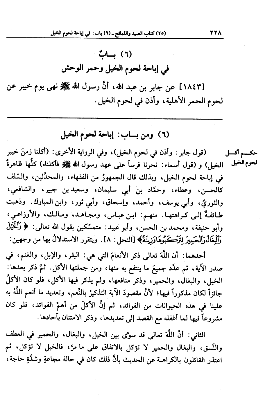 (قول جابر: وأذن في لحوم الخيل)، وفي الرواية الأخرى: (أكلنا زمن خيبر الخيل)، و (قول أسماء: نحرنا فرسًا على عهد رسول الله - صلى الله عليه وسلم - فأكلناه) كلها ظاهرةٌ في إباحة الخيل، وبذلك قال الجمهور من الفقهاء، والمحدِّثين، والسَّلف، كالحسن، وعطاء، وحمَّاد بن أبي سليمان، وسعيد بن جبير، والشافعي، والثوري، وأبي يوسف، وأحمد، وإسحاق، وأبي ثور، وابن المبارك. وذهبت طائفة إلى كراهتها. منهم: ابن عباس، ومجاهد، ومالك، والأوزاعي، وأبو حنيفة، ومحمد بن الحسن، وأبو عبيد: متمسكين بقول الله تعالى: {وَالخَيلَ وَالبِغَالَ وَالحَمِيرَ لِتَركَبُوهَا وَزِينَةً} ويتقرر الاستدلال بها من وجهين: