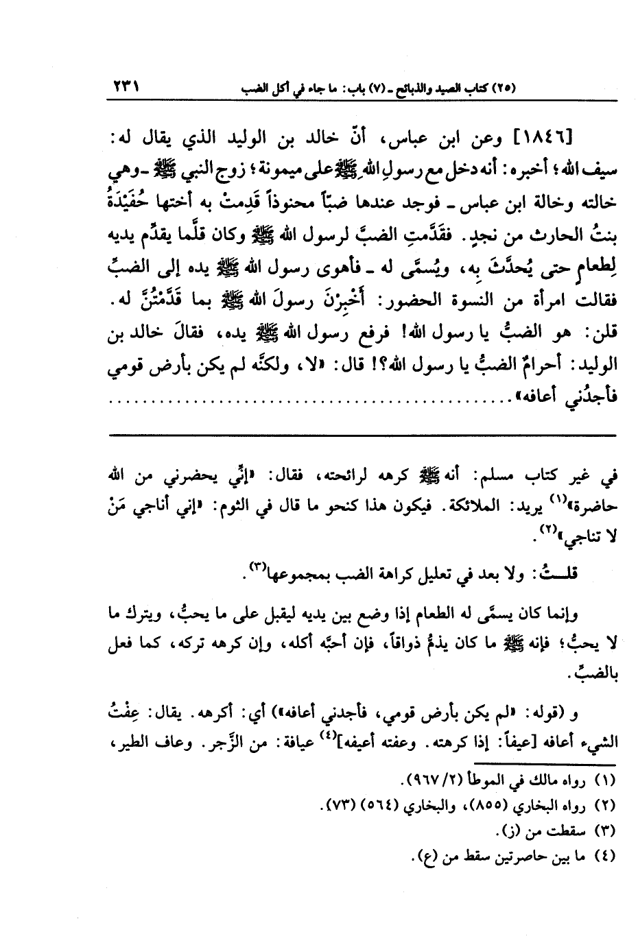 [1846] وعن ابن عَبَّاسٍ أَنَّ خَالِدَ بنَ الوَلِيدِ الَّذِي يُقَالَ لَهُ: سَيفُ اللَّهِ، أَخبَرَهُ أَنَّهُ دَخَلَ مَعَ رَسُولِ اللَّهِ صَلَّى اللَّهُ عَلَيهِ وَسَلَّمَ عَلَى مَيمُونَةَ زَوجِ النَّبِيِّ صَلَّى اللهُ عَلَيهِ وَسَلَّمَ - وَهِيَ خَالَتُهُ وَخَالَةُ ابنِ عَبَّاسٍ - فَوَجَدَ عِندَهَا ضَبًّا مَحنُوذًا، قَدِمَت بِهِ أُختُهَا حُفَيدَةُ بِنتُ الحَارِثِ مِن نَجدٍ، فَقَدَّمَت الضَّبَّ لِرَسُولِ اللَّهِ صَلَّى اللهُ عَلَيهِ وَسَلَّمَ، وَكَانَ قَلَّمَا يُقَدّمُ يديه لطَعَام حَتَّى يُحَدَّثَ بِهِ، وَيُسَمَّى لَهُ، فَأَهوَى رَسُولُ اللَّهِ صَلَّى اللَّهُ عَلَيهِ وَسَلَّمَ يَدَهُ إِلَى الضَّبِّ، فَقَالَت امرَأَةٌ مِن النِّسوَةِ الحُضُورِ: أَخبِرنَ رَسُولَ اللَّهِ صَلَّى اللَّهُ عَلَيهِ وَسَلَّمَ بِمَا قَدَّمتُنَّ لَهُ، قُلنَ: هُوَ الضَّبُّ يَا رَسُولَ اللَّهِ، فَرَفَعَ رَسُولُ اللَّهِ صَلَّى اللَّهُ عَلَيهِ وَسَلَّمَ يَدَهُ، فَقَالَ خَالِدُ بنُ الوَلِيدِ: أَحَرَامٌ الضَّبُّ يَا رَسُولَ اللَّهِ؟ قَالَ: لَا، وَلَكِنَّهُ لَم يَكُن بِأَرضِ قَومِي، فَأَجِدُنِي أَعَافُهُ.