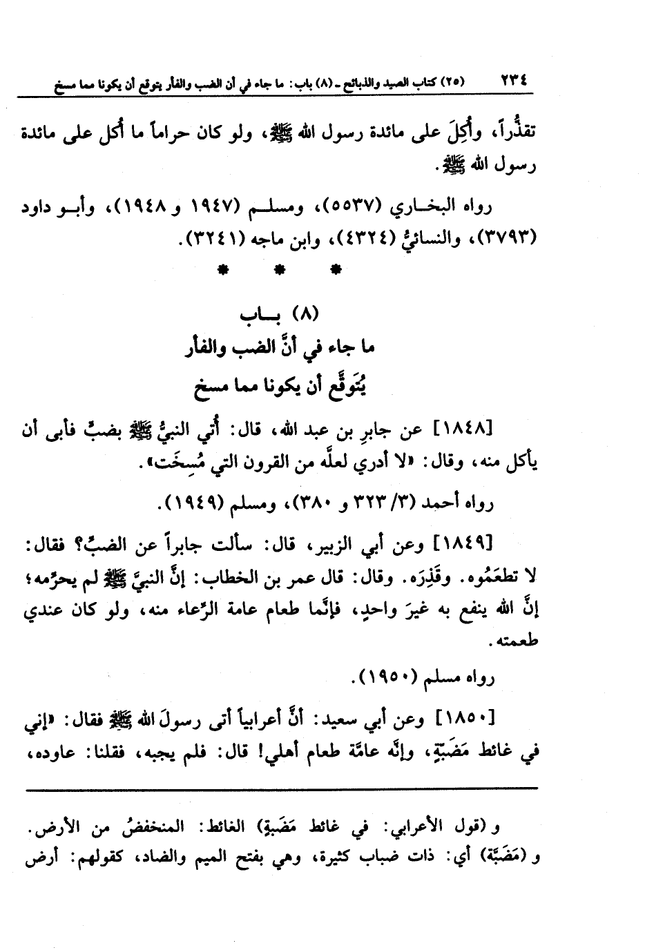 [1849] وعَن أَبِي الزُّبَيرِ قَالَ: سَأَلتُ جَابِرًا عَن الضَّبِّ، فَقَالَ: لَا تَطعَمُوهُ، وَقَذِرَهُ. وَقَالَ: قَالَ عُمَرُ بنُ الخَطَّابِ: إِنَّ النَّبِيَّ صَلَّى اللَّهُ عَلَيهِ وَسَلَّمَ لَم يُحَرِّمهُ؛ إِنَّ اللَّهَ يَنفَعُ بِهِ غَيرَ وَاحِدٍ، فَإِنَّمَا طَعَامُ عَامَّةِ الرِّعَاءِ مِنهُ، وَلَو كَانَ عِندِي طَعِمتُهُ.