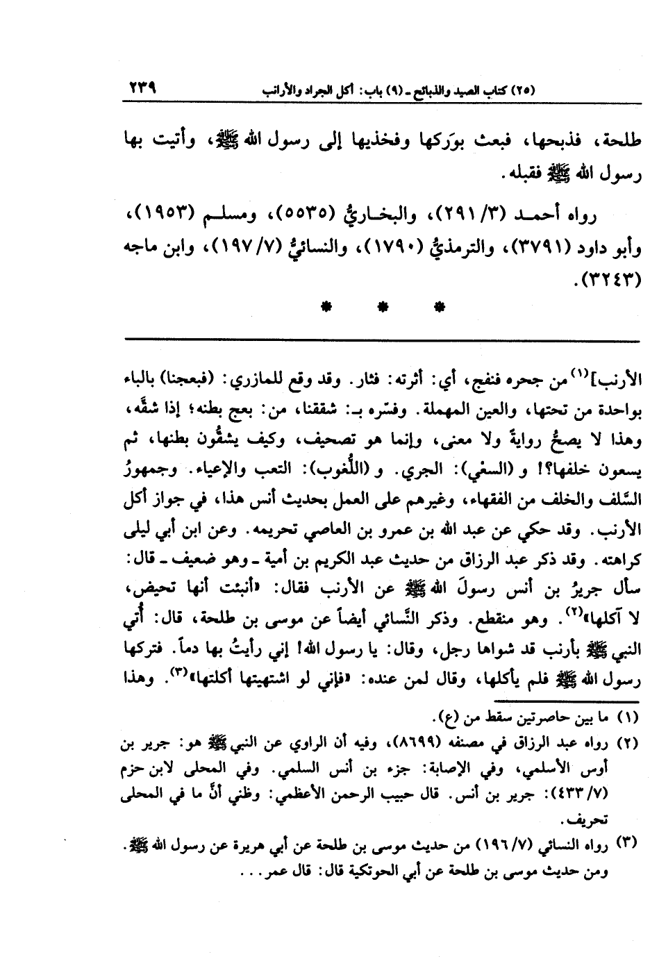 و(السَّعي): الجري. و (اللُّغوب): التعب والإعياء. وجمهور السَّلف والخلف من الفقهاء وغيرهم على العمل بحديث أنس هذا، في جواز أكل الأرنب. وقد حكي عن عبد الله بن عمرو بن العاصي تحريمه. وعن ابن أبي ليلى كراهته. وقد ذكر عبد الرزاق من حديث عبد الكريم بن أمية - وهو ضعيف - قال: سأل جريرُ بن أنس رسول الله - صلى الله عليه وسلم - عن الأرنب فقال: (أُنبئت أنها تحيضُ، لا آكُلُها) (¬2). وهو منقطع. وذكر النسائي أيضًا عن موسى بن طلحة، قال: أتي النبي - صلى الله عليه وسلم - بأرنب قد شواها رجل، وقال: يا رسول الله! إني رأيت بها دمًا. فتركها رسول الله - صلى الله عليه وسلم - فلم يأكلها، وقال لمن عنده: (فإني لو اشتهيتها أكلتها) (¬3). وهذا