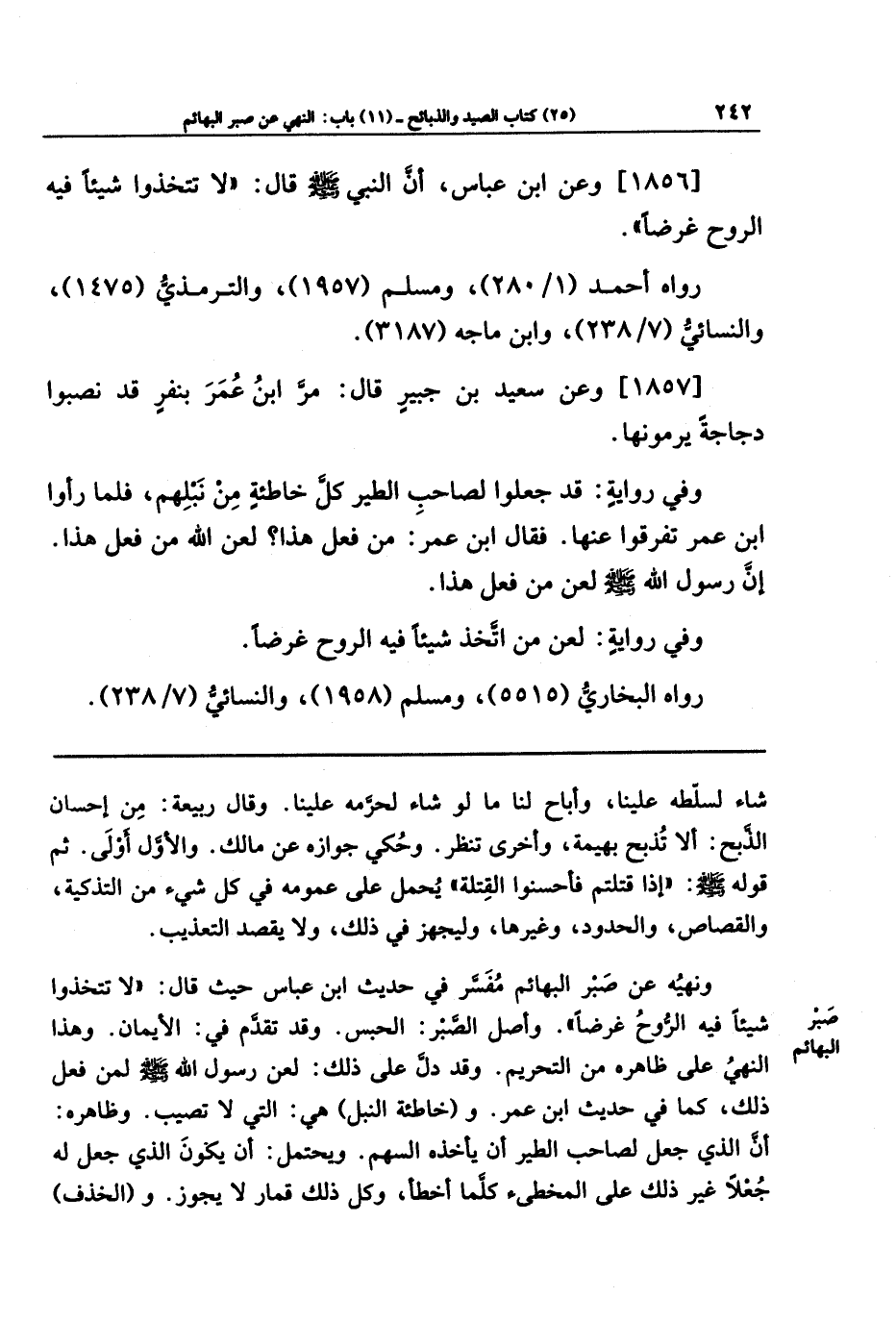 [1856] وعَن ابنِ عَبَّاسٍ: أَنَّ النَّبِيَّ صَلَّى اللَّهُ عَلَيهِ وَسَلَّمَ قَالَ: لَا تَتَّخِذُوا شَيئًا فِيهِ الرُّوحُ غَرَضًا.