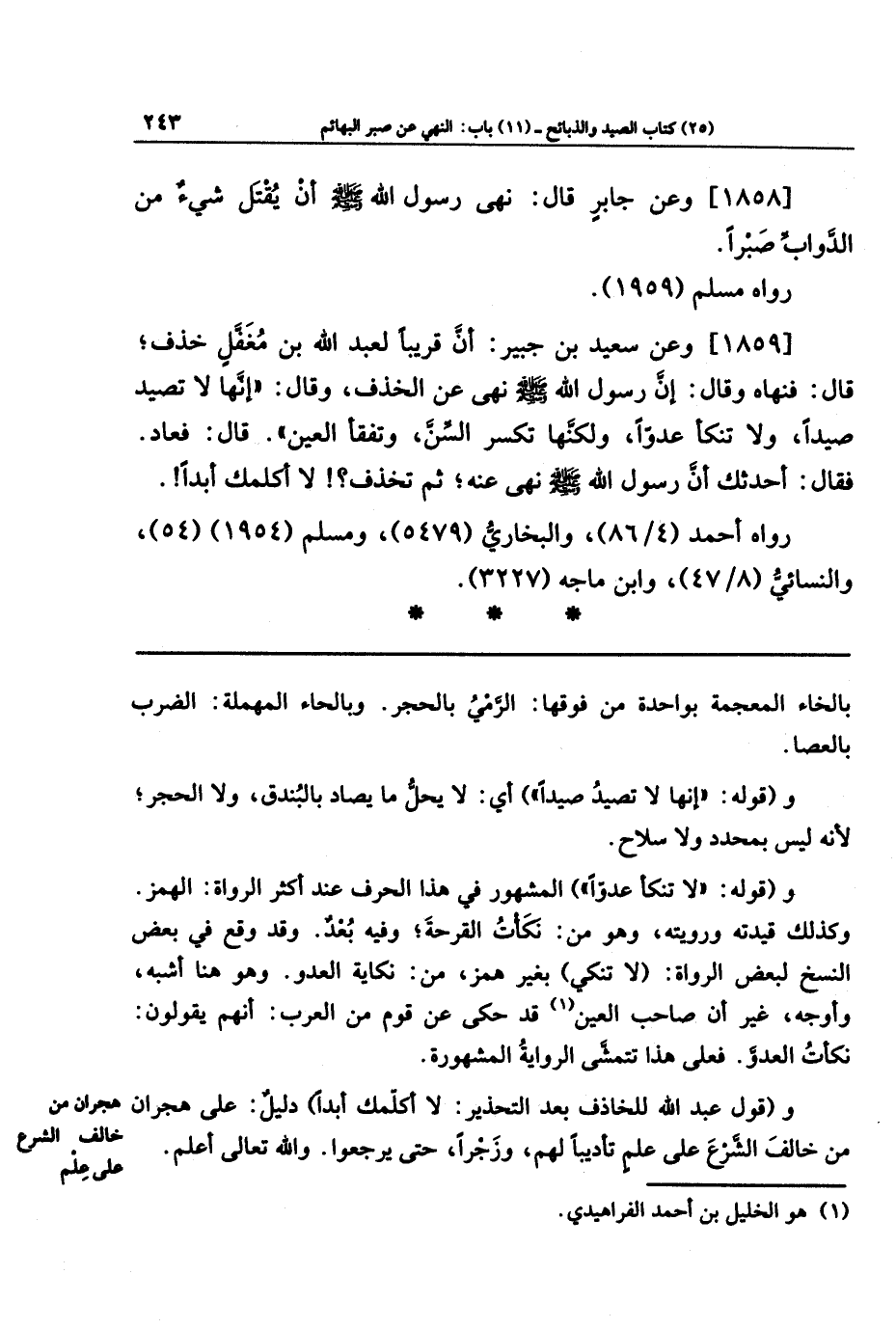 [1859] وعَن سَعِيدِ بنِ جُبَيرٍ أَنَّ قَرِيبًا لِعَبدِ اللَّهِ بنِ مُغَفَّلٍ خَذَفَ؛ قَالَ: فَنَهَاهُ وَقَالَ: إِنَّ رَسُولَ اللَّهِ صَلَّى اللَّهُ عَلَيهِ وَسَلَّمَ نَهَى عَن الخَذفِ وَقَالَ: إِنَّهَا لَا تَصِيدُ صَيدًا، وَلَا تَنكَأُ عَدُوًّا، وَلَكِنَّهَا تَكسِرُ السِّنَّ وَتَفقَأُ العَينَ. قَالَ: فَعَادَ، فَقَالَ: أُحَدِّثُكَ أَنَّ رَسُولَ اللَّهِ صَلَّى اللَّهُ عَلَيهِ وَسَلَّمَ نَهَى عَنهُ، ثُمَّ تَخذِفُ! لَا أُكَلِّمُكَ أَبَدًا! .