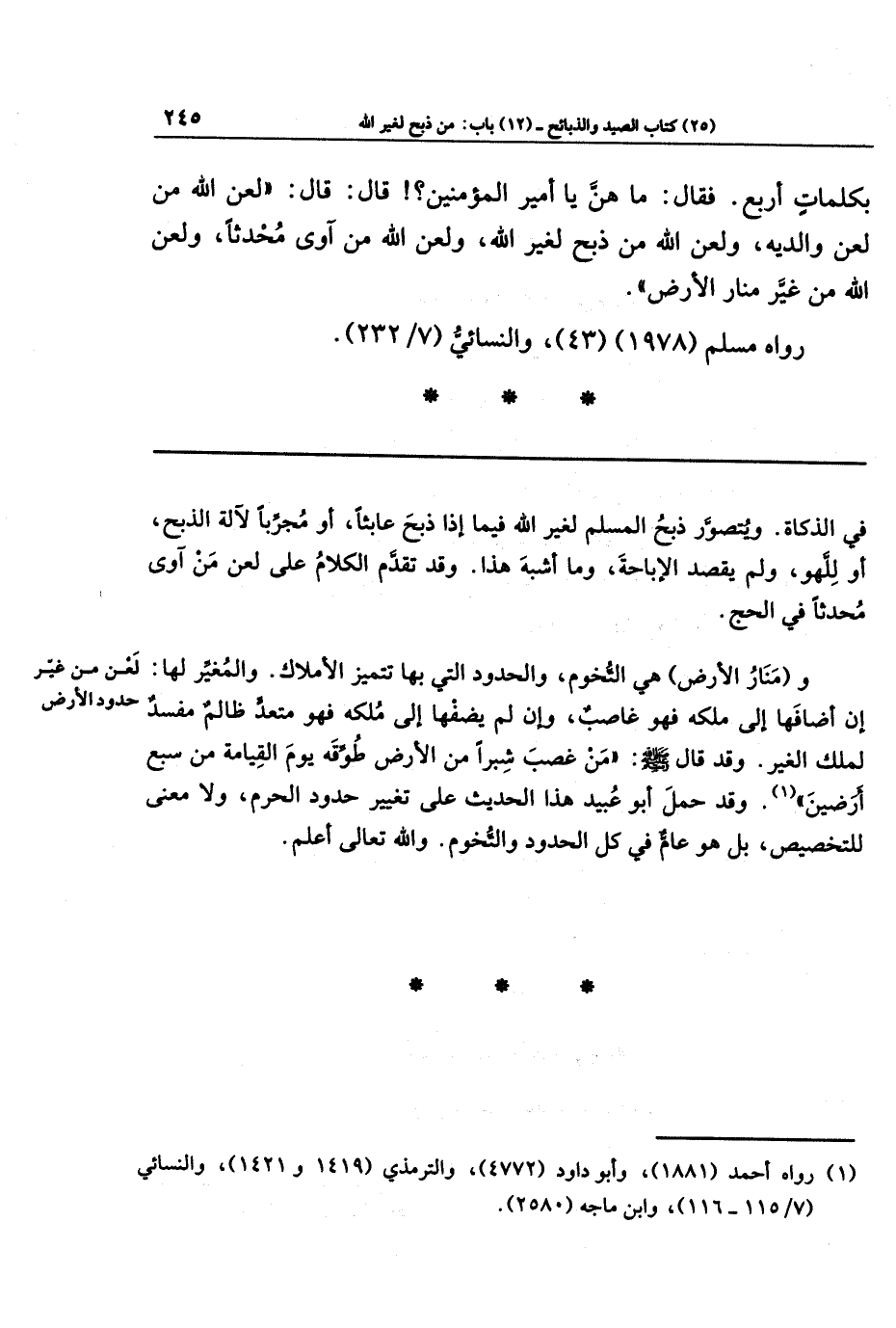 و(منار الأرض) هي التخوم، والحدود التي بها تتميَّز الأملاك. والمغيِّر لها: إن أضافها إلى ملكه فهو غاصبٌ، وإن لم يضفها إلى ملكه فهو متعدٍّ ظالِمٌ مفسدٌ لِمُلك الغير. وقد قال - صلى الله عليه وسلم -: (من غصب شبرًا من الأرض طوَّقه يوم القيامة من سبع أرضين) (¬1). وقد حمل أبو عبيد هذا الحديث على تغيير حدود الحرم، ولا معنى للتخصيص، بل هو عام في كل الحدود والتخوم. والله تعالى أعلم.