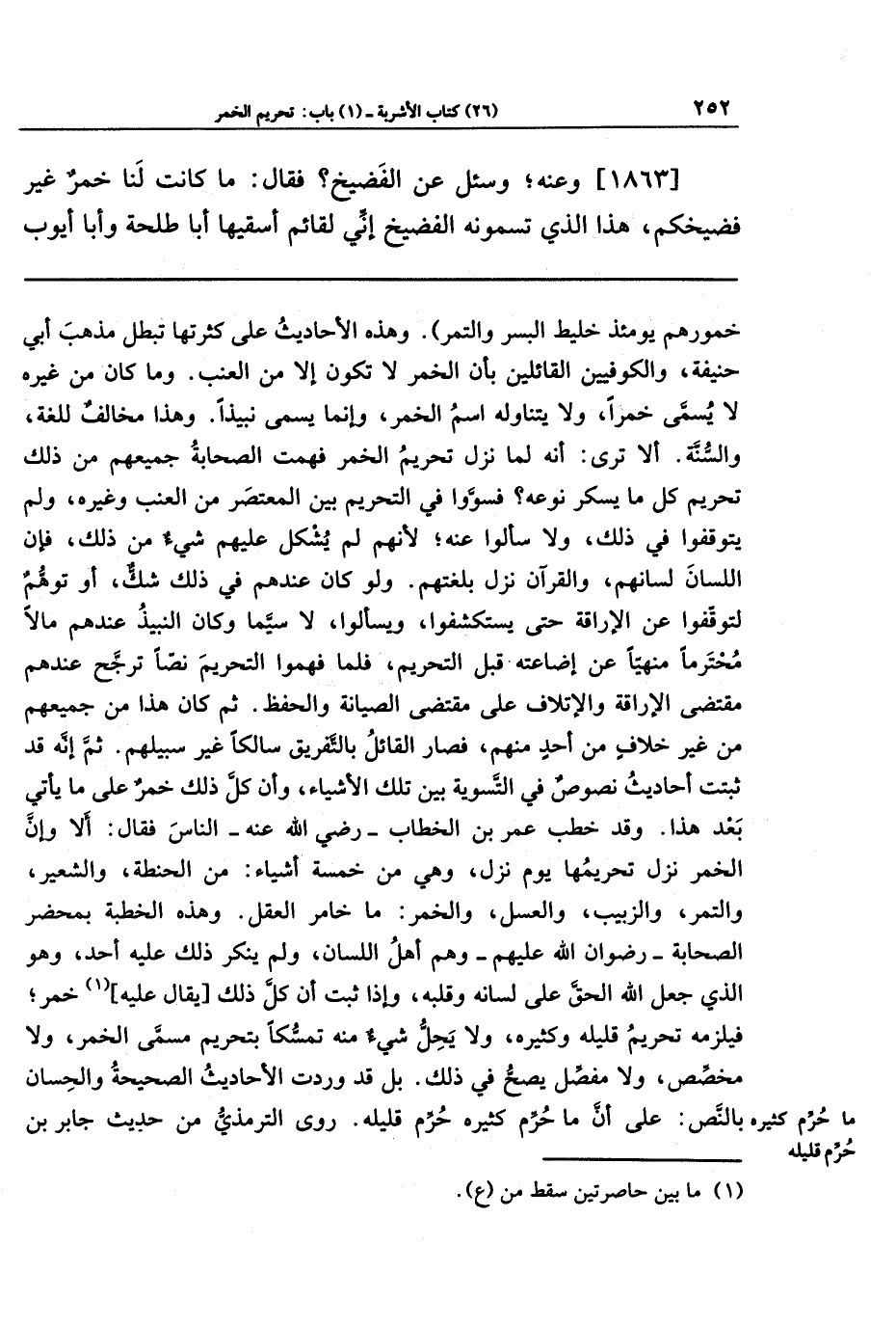 خمورهم يومئذ خليط البسر والتمر). وهذه الأحاديث على كثرتها تبطل مذهب أبي حنيفة، والكوفيين القائلين بأن الخمر لا تكون إلا من العنب. وما كان من غيره لا يُسمَّى خمرًا، ولا يتناوله اسم الخمر، وإنما يُسمى نبيذًا. وهذا مخالف للُّغة، والسُّنَّة.