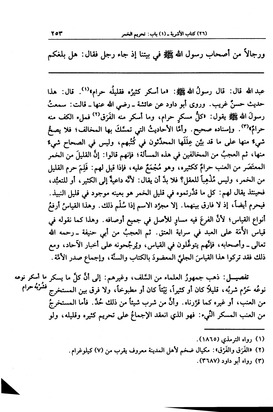 عبد الله قال: قال رسول الله - صلى الله عليه وسلم -: (ما أسكر كثيره فقليله حرام) (¬1). قال: هذا حديث حسن غريب. وروى أبو داود عن عائشة - رضي الله عنها - قالت: سمعت رسول الله - صلى الله عليه وسلم - يقول: (كلُّ مسكر حرام، وما أسكر منه الفَرَق (¬2)، فملء الكفِّ منه حرام) (¬3). وإسناده صحيح.