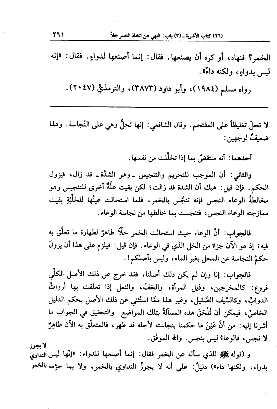 فالجواب: إنا وإن لم يكن ذلك أصلنا، فقد خرج عن ذلك الأصل الكلِّي فروع: كالمخرجين، وذيل المرأة، والخف، والنعل إذا تعلقت بها أرواث الدواب، وكالسَّيف الصقيل، وغير هذا مِمَّا استثني عن ذلك الأصل بحكم الدليل الخاصّ، فيمكن أن تَلحق هذه المسألة بتلك المواضع. والتحقيق في الجواب ما أشرنا إليه: من أن عين ما حكمنا بنجاسته لأجله قد طهر، فالمتعلق به الآن طاهرٌ لا نجس، فالوعاء ليس بنجس. والله الموفق.