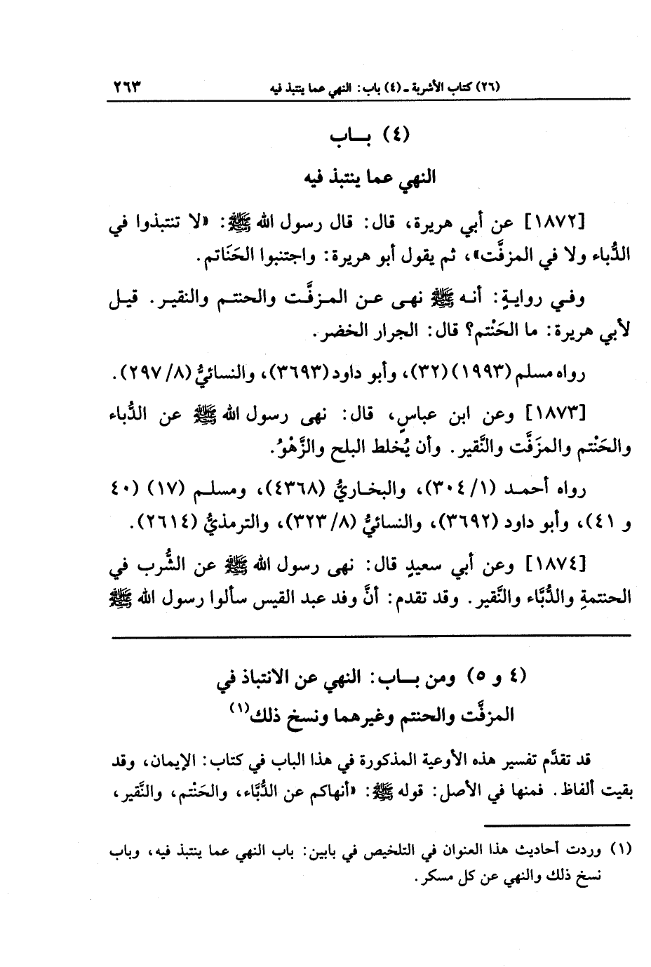(4 و 5) ومن باب: النهي عن الانتباذ في المزفت والحنتم وغيرهما ونسخ ذلك (¬1)