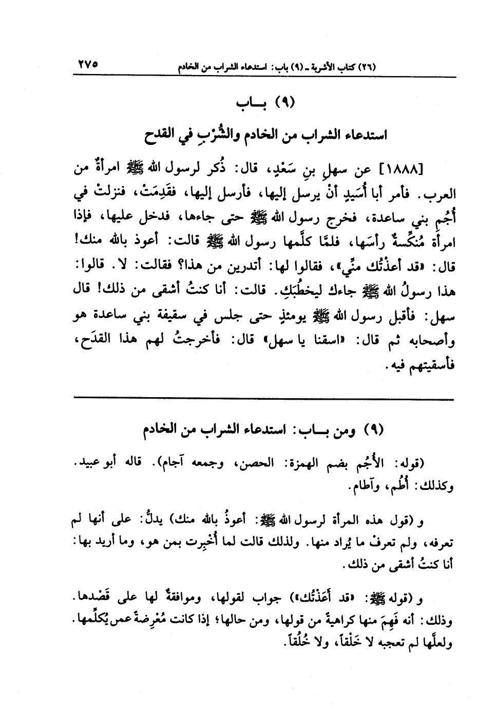 (9) باب استدعاء الشراب من الخادم والشرب في القدح
