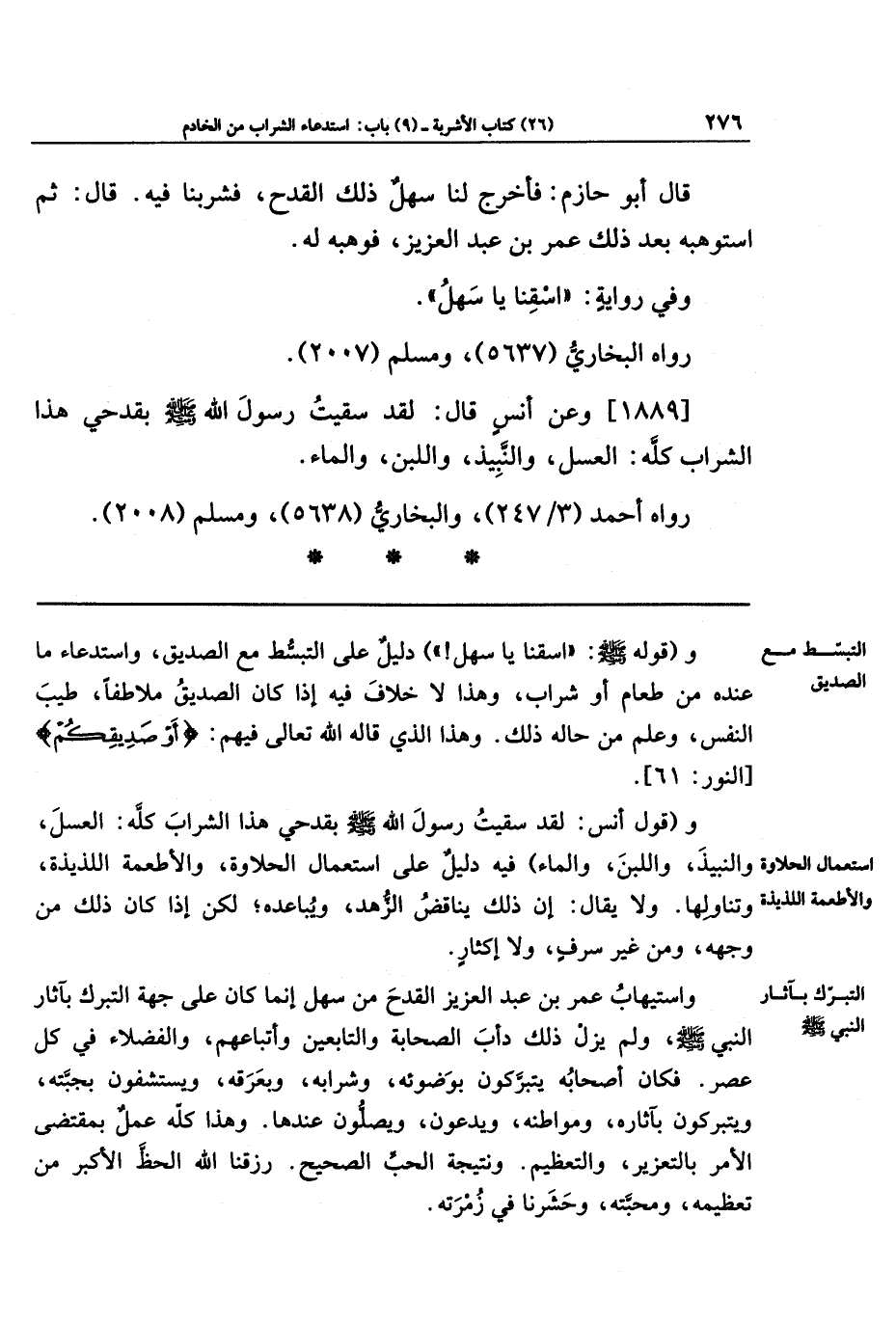 واستيهابُ عمر بن عبد العزيز القدح من سهل؛ إنما كان على جهة التَّبُّرك بآثار النبي - صلى الله عليه وسلم -، ولم يزل ذلك دأب الصحابة والتابعين وأتباعهم، والفضلاء في كلِّ عصر. فكان أصحابه يتبرَّكون بوضوئه، وشرابه، وبعرقه، ويستشفون بِجُبَّته، ويتبركون بآثاره، ومواطنه، ويدعون، ويصلُّون عندها. وهذا كلُّه عمل بمقتضى الأمر بالتعزير، والتعظيم. ونتيجة الحُبِّ الصحيح. رزقنا الله الحظَّ الأكبر من تعظيمه، ومحبَّته، وحشرنا في زمرته.