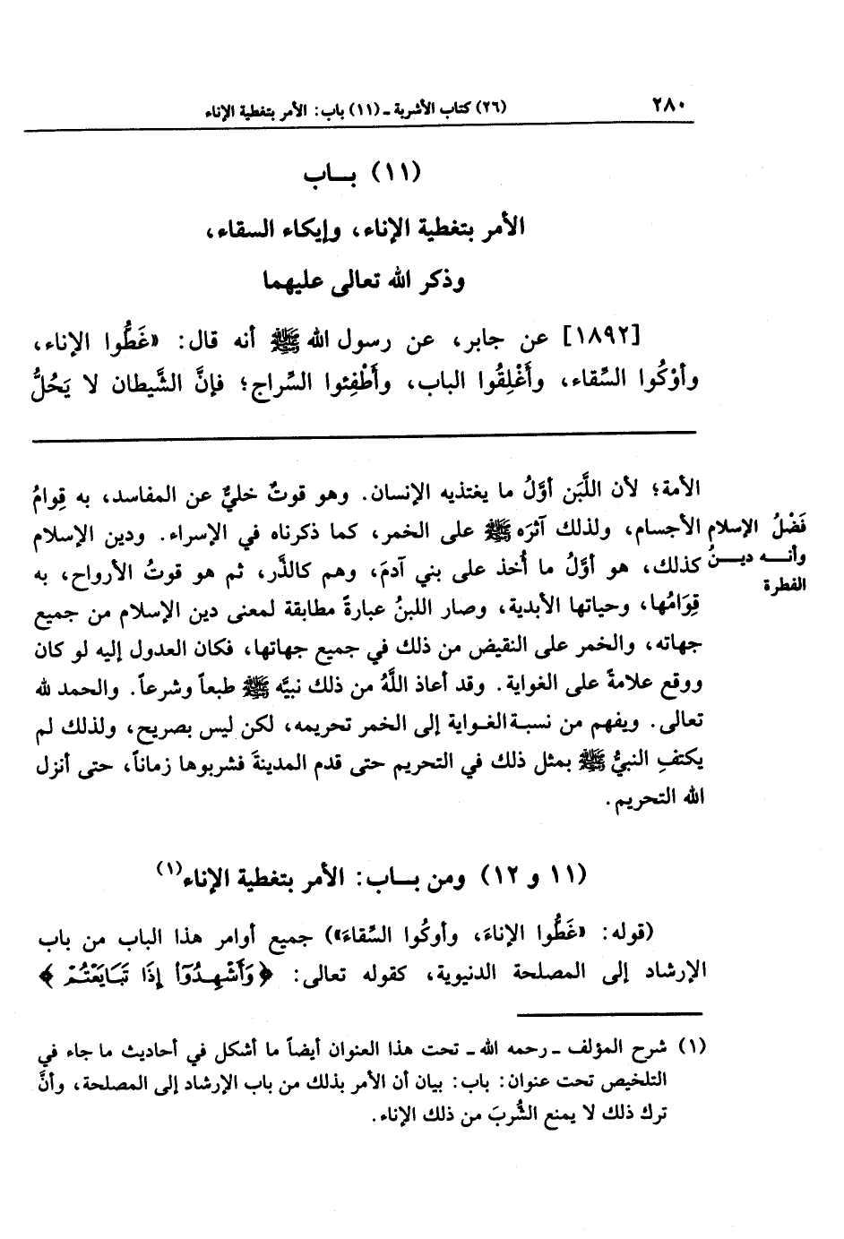 (11) باب الأمر بتغطية الإناء، وإيكاء السقاء، وذكر الله تعالى عليهما