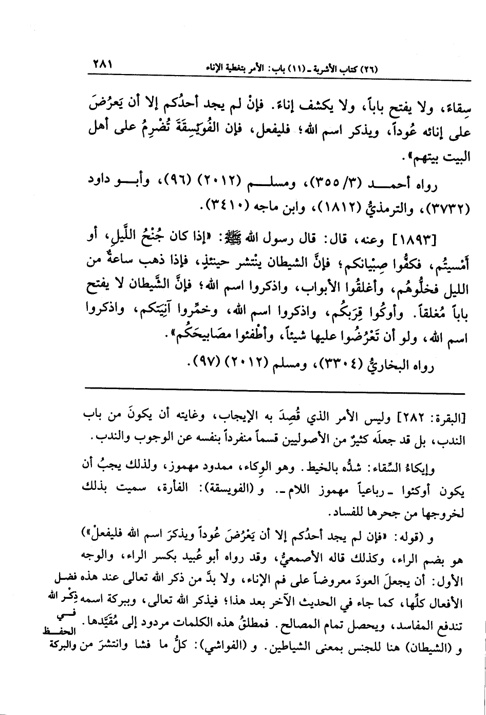 [1893] وعنه، قال: قَالَ رَسُولُ اللَّهِ صَلَّى اللهُ عَلَيهِ وَسَلَّمَ: إِذَا كَانَ جُنحُ اللَّيلِ أَو أَمسَيتُم، فَكُفُّوا صِبيَانَكُم، فَإِنَّ الشَّيطَانَ يَنتَشِرُ حِينَئِذٍ، فَإِذَا ذَهَبَ سَاعَةٌ مِن اللَّيلِ فَخَلُّوهُم، وَأَغلِقُوا الأَبوَابَ، وَاذكُرُوا اسمَ اللَّهِ، فَإِنَّ الشَّيطَانَ لَا يَفتَحُ بَابًا مُغلَقًا، وَأَوكُوا قِرَبَكُم، وَاذكُرُوا اسمَ اللَّهِ، وَخَمِّرُوا آنِيَتَكُم، وَاذكُرُوا اسمَ اللَّهِ، وَلَو أَن تَعرُضُوا عَلَيهَا شَيئًا، وَأَطفِئُوا مَصَابِيحَكُم.