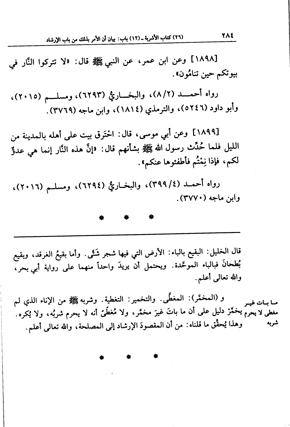 [1899] وعَن أَبِي مُوسَى قَالَ: احتَرَقَ بَيتٌ عَلَى أَهلِهِ بِالمَدِينَةِ مِن اللَّيلِ، فَلَمَّا حُدِّثَ رَسُولُ اللَّهِ صَلَّى اللَّهُ عَلَيهِ وَسَلَّمَ بِشَأنِهِم قَالَ: إِنَّ هَذِهِ النَّارَ إِنَّمَا هِيَ عَدُوٌّ لَكُم، فَإِذَا نِمتُم فَأَطفِئُوهَا عَنكُم.