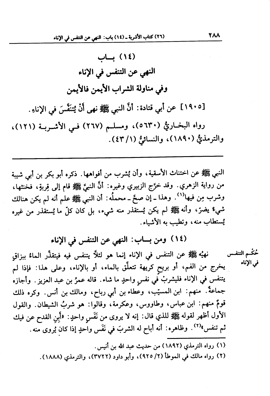 (14) باب النهي عن التنفس في الإناء وفي مناولة الشراب الأيمن فالأيمن