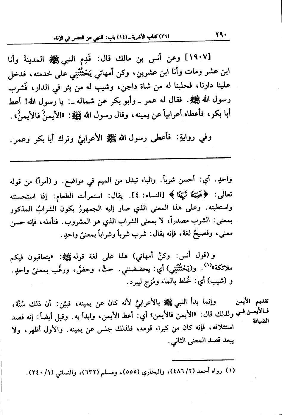 [1907] وعَن أَنَس بن مالك قَالَ: قَدِمَ النَّبِيُّ صَلَّى اللَّهُ عَلَيهِ وَسَلَّمَ المَدِينَةَ وَأَنَا ابنُ عَشرٍ، وَمَاتَ وَأَنَا ابنُ عِشرِينَ، وَكُنَّ أُمَّهَاتِي يَحثُثنَنِي عَلَى خِدمَتِهِ، فَدَخَلَ عَلَينَا دَارَنَا، فَحَلَبنَا لَهُ مِن شَاةٍ دَاجِنٍ، وَشِيبَ لَهُ مِن بِئرٍ فِي الدَّارِ، فَشَرِبَ رَسُولُ اللَّهِ صَلَّى اللهُ عَلَيهِ وَسَلَّمَ، فَقَالَ لَهُ عُمَرُ - وَأَبُو بَكرٍ عَن شِمَالِهِ -: يَا رَسُولَ اللَّهِ، أَعطِ أَبَا بَكرٍ، فَأَعطَاهُ أَعرَابِيًّا عَن يَمِينِهِ، وَقَالَ رَسُولُ اللَّهِ صَلَّى اللَّهُ عَلَيهِ وَسَلَّمَ: الأَيمَنَ فَالأَيمَنَ.